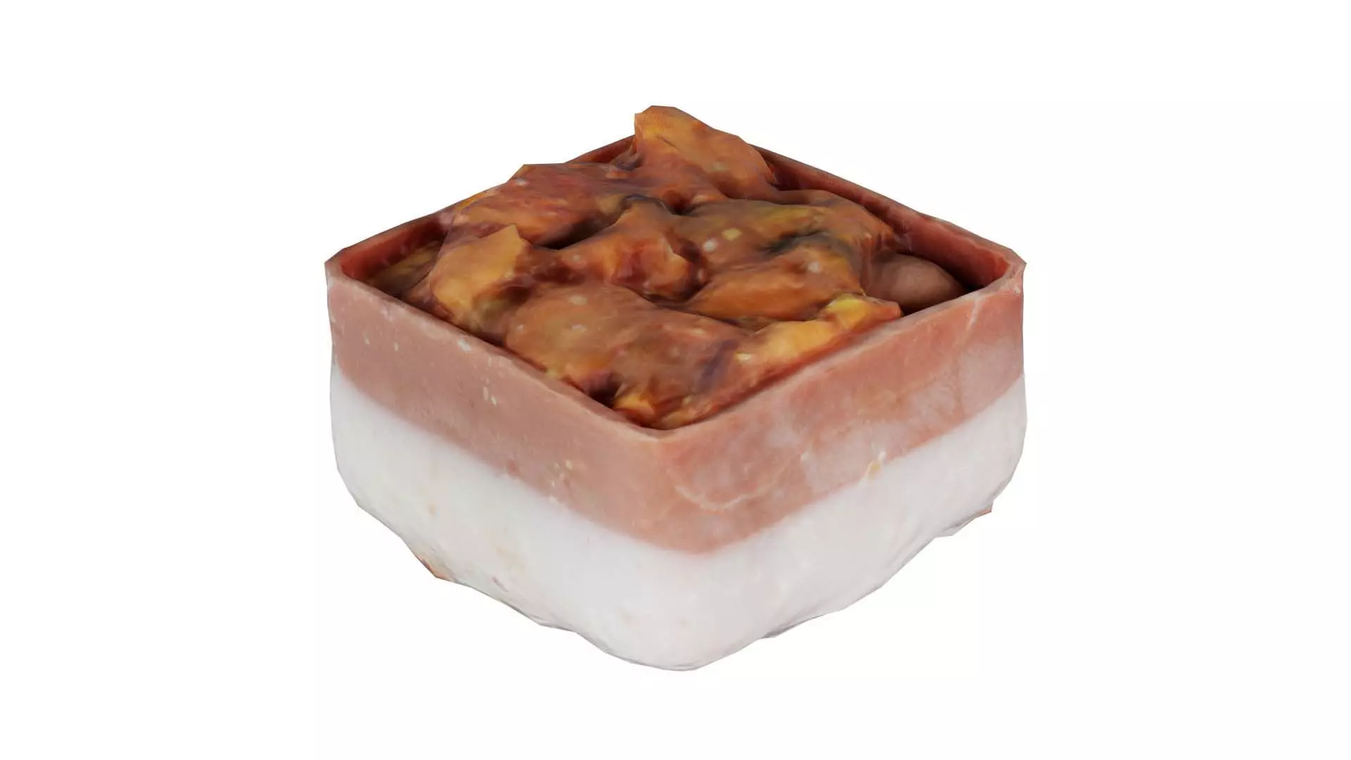 3D scanned model featuring a square of meat with a slice of cheese on top. This model, marble nuts chocolate, has been created using photogrammetry from a real world object.The raw scan data has been cleaned, retopologized and UV-unwrapped using Zbrush. The result is a low poly mesh with baked maps. The .obj and .mtl are configured so that maps will load automatically in the shader (tested in Blender). In addition, a Blender scene is provided with the model and shader already set up for rendering and export. Detailed information below: