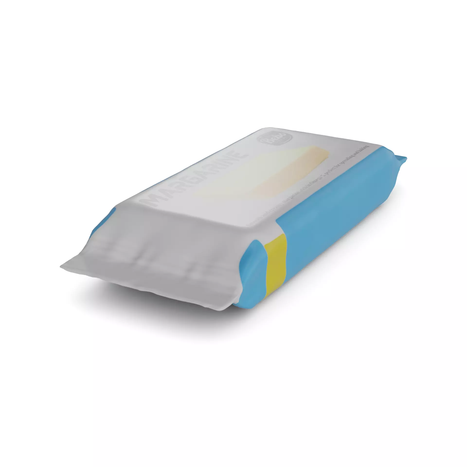 Margarine Sticks: A pack of margarine sticks, each individually wrapped in wax paper. The sticks are conveniently sized for measuring and are made from a blend of vegetable oils. The packaging is a cardboard box with a light blue color scheme. It features a label with the product name, weight/volume information, and a graphic of a stick of margarine.