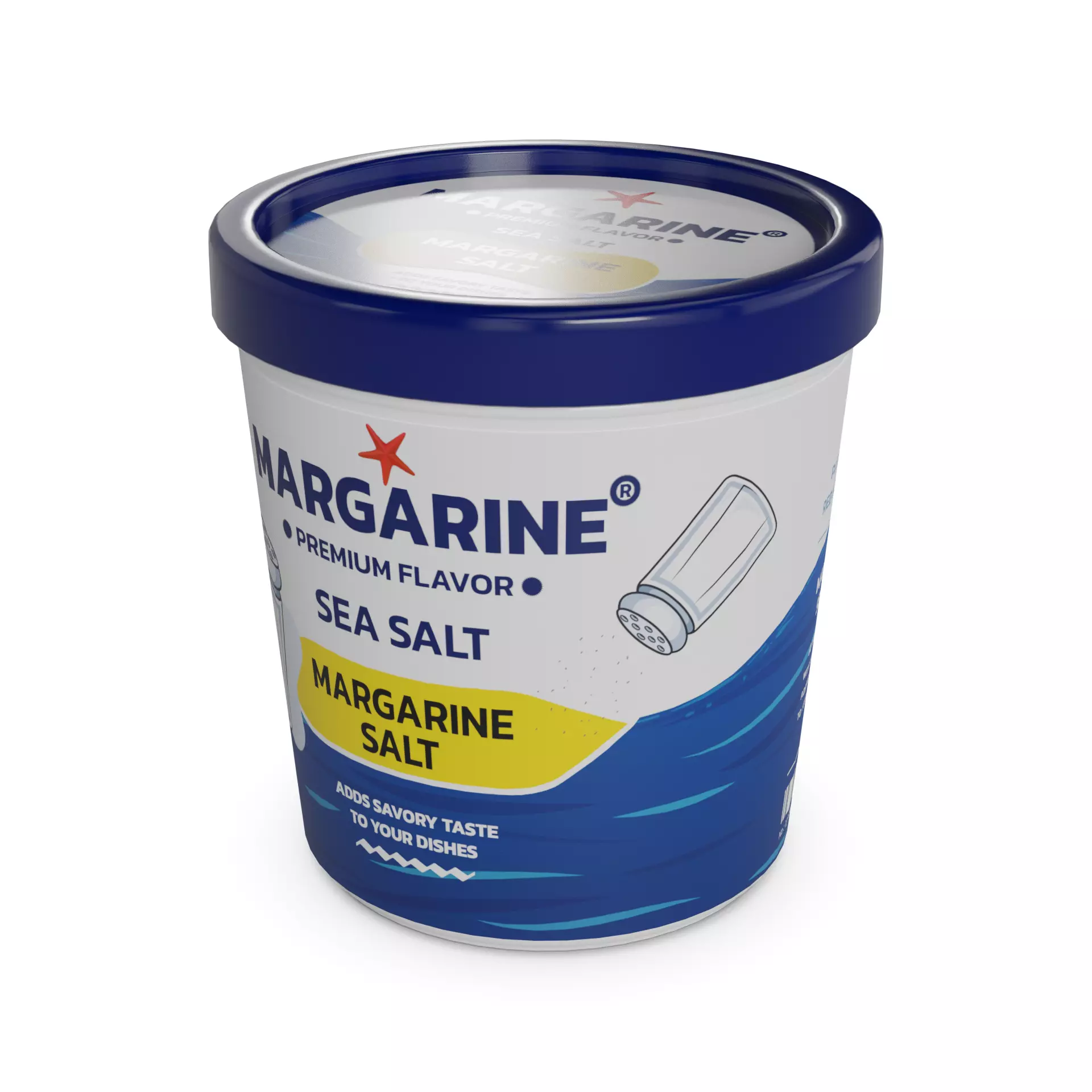 Margarine with Sea Salt: A tub of margarine with a hint of sea salt, adding a savory touch to your favorite dishes. The packaging is a sturdy plastic container with a blue color scheme, reminiscent of the sea. It features a label with the product name, flavor description, and a graphic of a salt shaker.