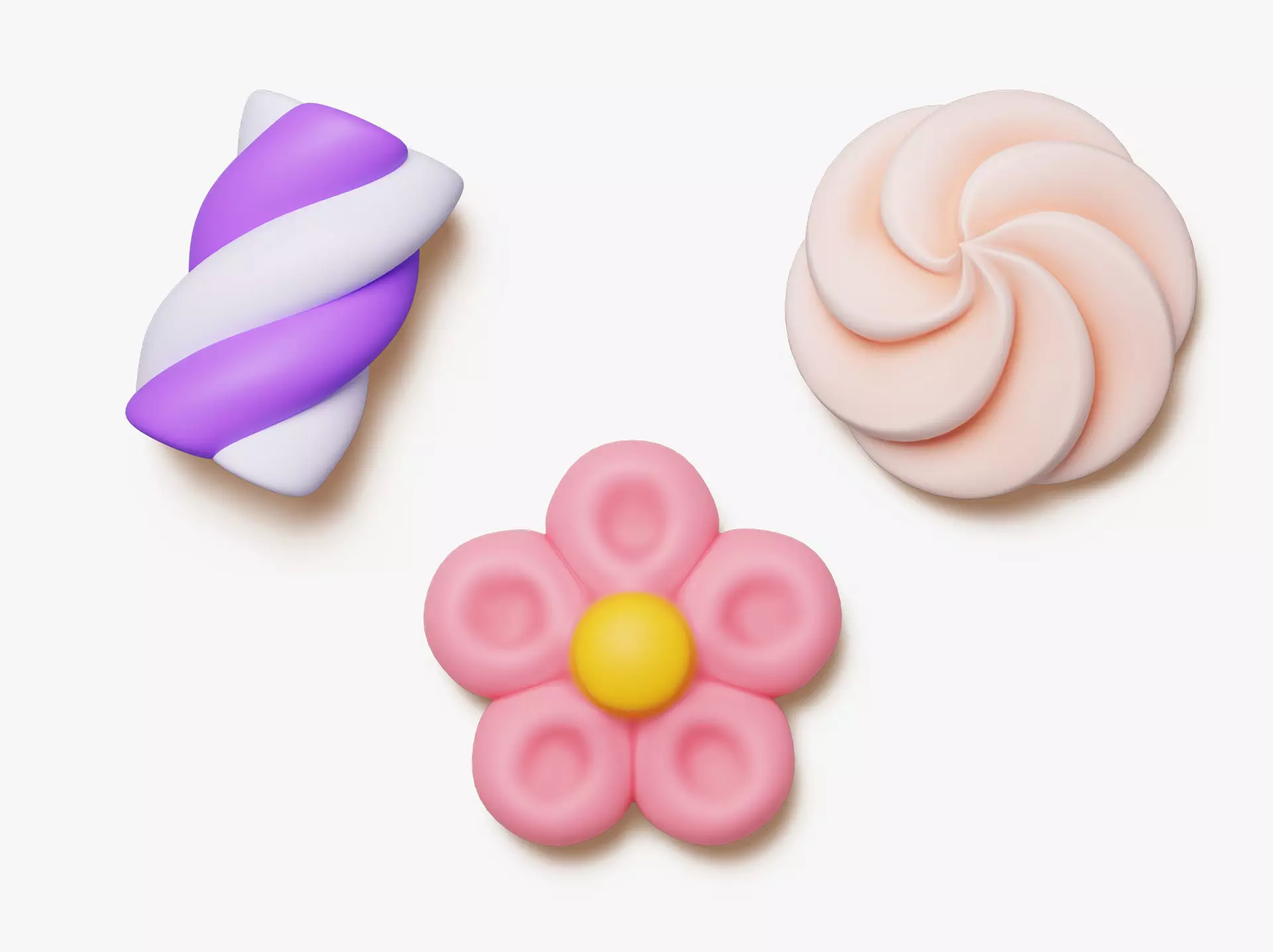 This 3D marshmallow candy set is created in a colorful cartoon style, combining playful shapes and vibrant tones to make it visually striking and fun. The set includes three different marshmallow-inspired designs: a twisted purple-and-white piece, a soft round swirl, and a charming pink flower with a yellow center. Each candy features smooth glossy surfaces, rounded edges, and a friendly aesthetic, making them suitable for a wide variety of creative uses.