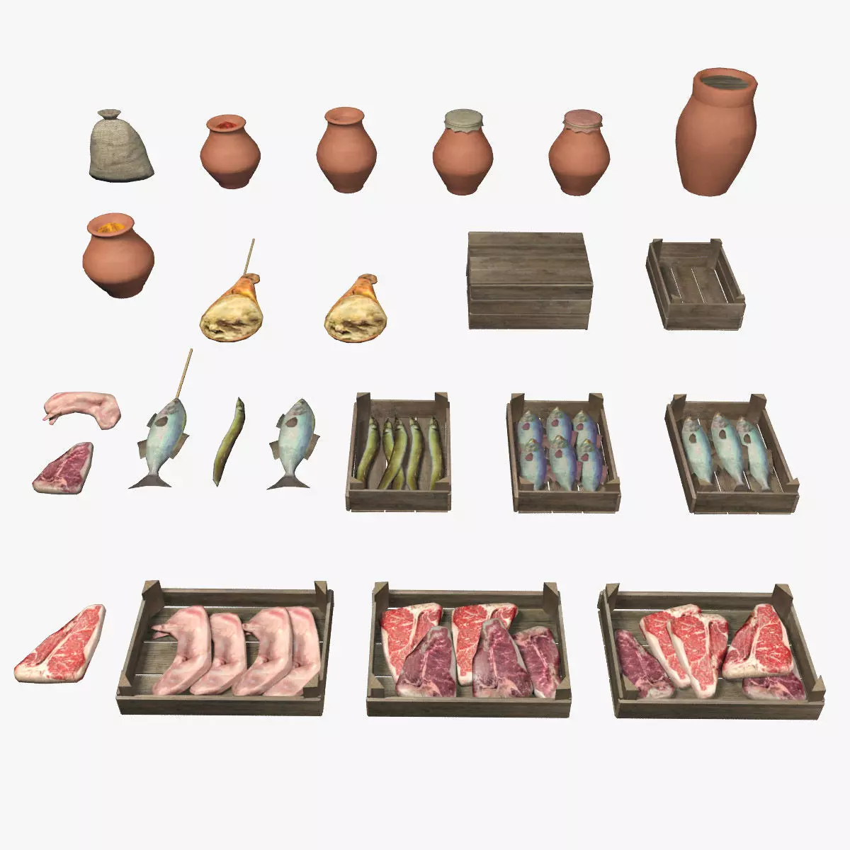 These street markets items are low poly 3d models for your game projects like MMORPG, strategy, third person, fantasy, medieval, etc.The models were originally modeled in 3ds Max 2012 and rendered with Mental Ray.In this pack you can find 23 unique models, every model with better LOD versions for performance.