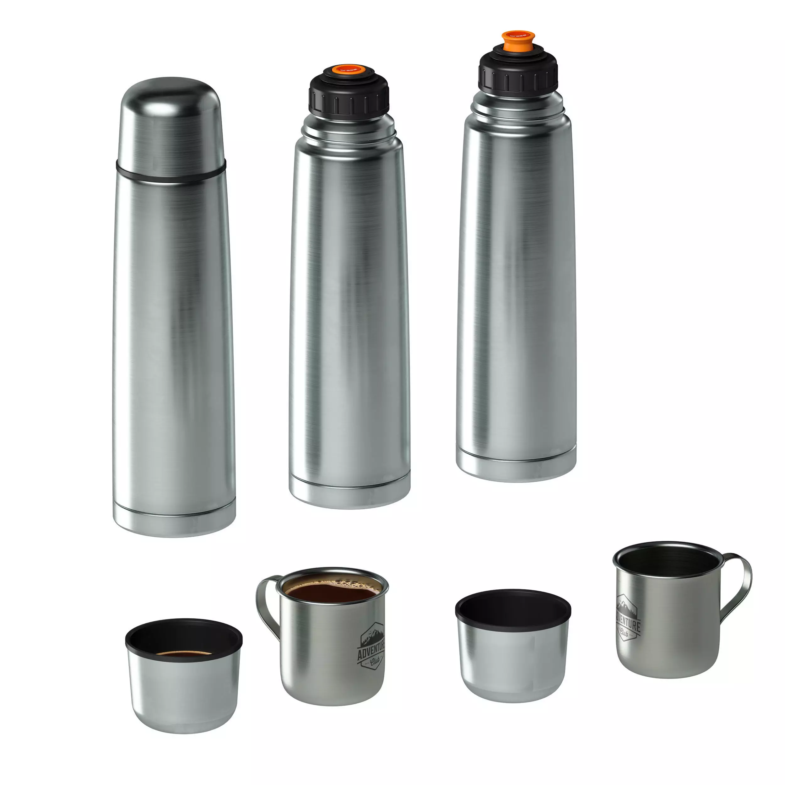 3d model of a metal (steel, aluminum) thermos with a screw-off lid - mug. The model also includes a model of a metal (steel, aluminum) mug with a handle on rivets. In the model, the thermos is presented in three states: with a closed lid, without a lid with a closed mechanism and without a lid with an open mechanism (dispenser). The mug and lid are in two states: empty and with a drink - hot tea or coffee. The model is made for smoothing. Additionally, in a separate folder, a variant of textures without logos is attached.