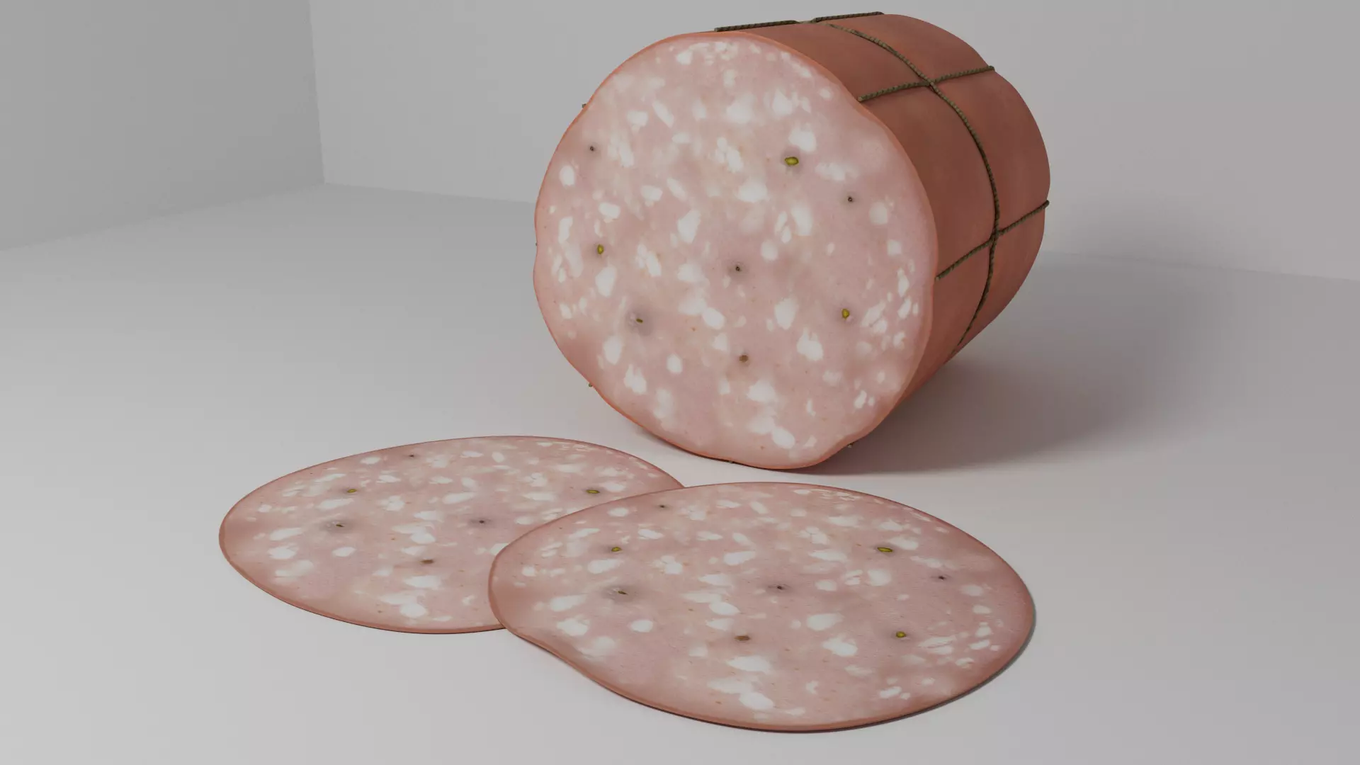 3d model of mortadella. The file contains texture maps, color maps, normal maps and meshes.Materials are not included. Preview images are rendered with vray materials and lights.