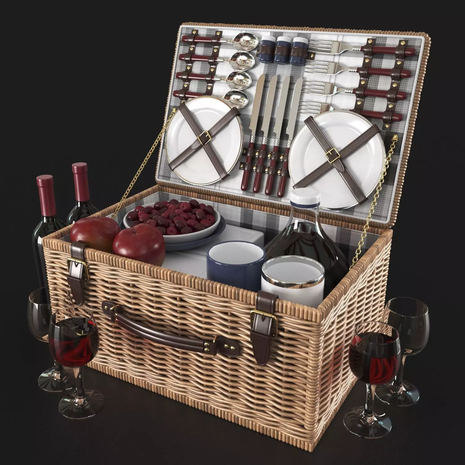 NEWBURY picnic basket decor setEnglish-style basket with deluxe service for four. Features porcelain plates. Made of willow with cotton lining. A picnic set in a basket, including a basket, apples, cherries, knives, forks, spoons, glasses, glasses, and wine.520 x 337 x 203 mm
