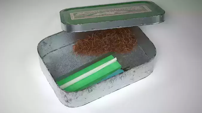A 3D Model of a vintage worn Tobacco Tin with Lighter and Papers. V-Ray Fur and V-RayHairNext mtl have been used to create the tobacco. PBR Metal-rough workflow used. All maps/texture are included.