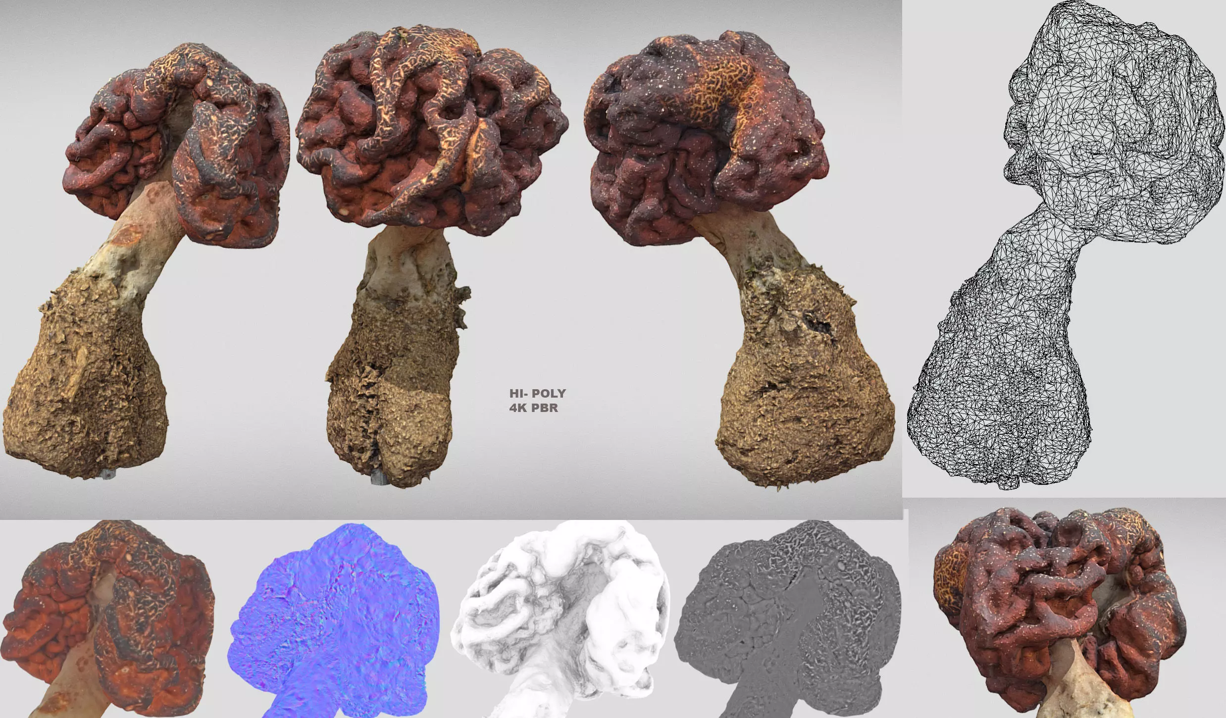 Variation 4 - High - poly model of Gyromitra for usage in VFX. This mushroom has different names such as brain mushroom, turban fungus, elephant ears, and beefsteak mushroom / morel. German term lorchel is a result of the older lorche, itself from the 18th century Low German Lorken, aligning with the similar-sounding (and similar-looking) morchel. Other names include: Frühjahrs-Giftlorchel, Frühjahrslorchel, Frühlorchel, Giftlorchel, hongo bonete, falsa colmenilla, Gyromitra esculenta, fausse morille, gyromitre fausse morille, bobausis. Its top has a shapless, or rather a shape that resembbes brain or greek nut. It can be of 5-20cm in size. This particular one was around 8-10cm in size.It has some poison, but if you boil it 3 times its ok to eat it. Has slightly crunchy texture at least if you compare it to other mushrooms. Some also dry it and use its powder. It grous in Europ and north america. Likes quite sandy soil. Its edable (with specific preparations) in some countries and considered poisonous in other contries. The fungus was first named in 1800, by mycologist Christian Hendrik Persoon, as Helvella esculenta, and gained its current accepted binomial name when the Swedish mycologist Elias Magnus Fries placed it in the genus Gyromitra in 1849. The genus name is derived from the Greek terms gyros round and mitra headband Its specific epithet is derived from the Latin esculentus, edible. The model was obtaines using photogrammetry so espetialy good textures where captured. Delighting was performed to get cleaner color texture. Includes normal maps, height map, Ambient oclussion map, and extra bump map. Metalness and rufness are mabe out of bump map, so one can just use blaack / whte color if need be. Original textures come at 8k png, and 4k jpg are provided. The topology of model is all triangles derived from decimation master in Zbrush. (low poly / quad verssions are coming latter as seperate models)