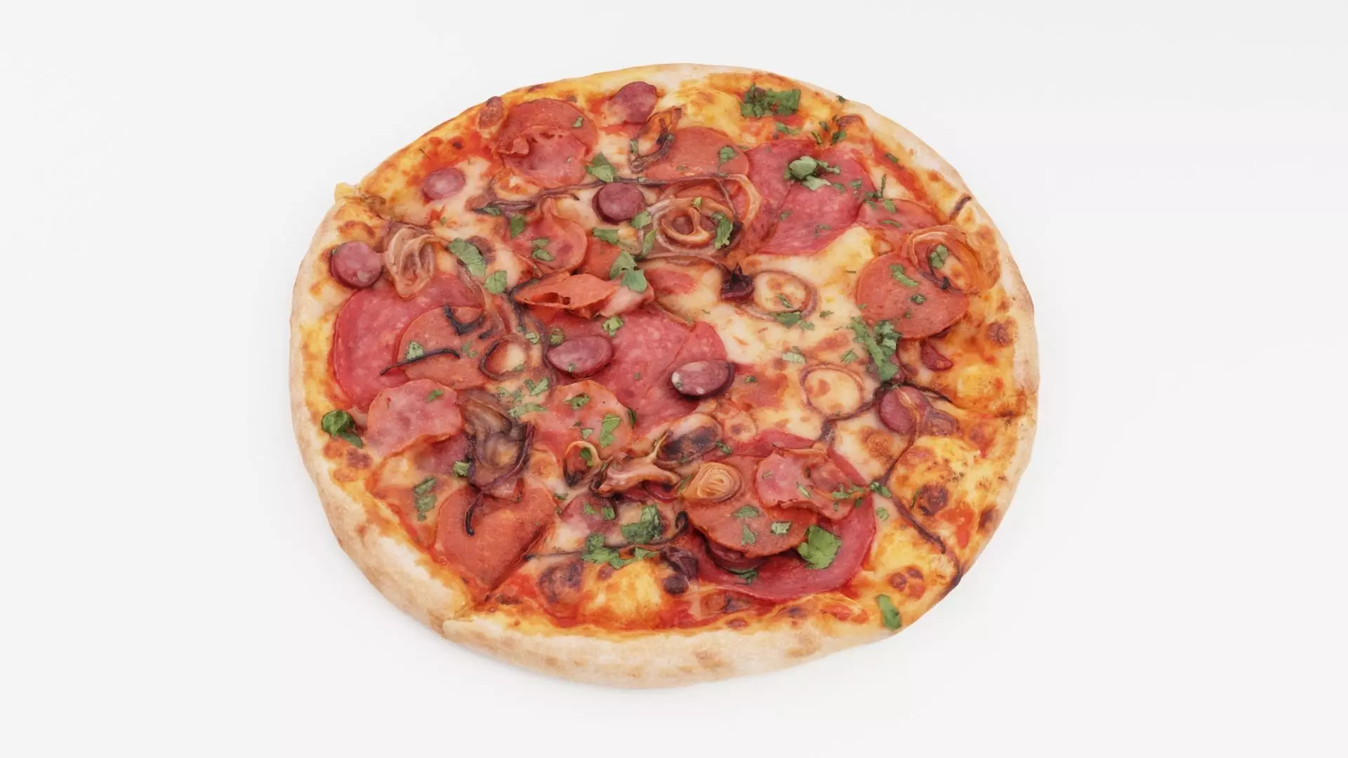 Pizza with onions salamy and sausageThis is an optimized 3D model with baked normal and other maps from 3D scan. Perfect for GPU rendering, use in Real-time engines, games etc.The resolution for each map is 4096x4096. You may find a source 3D scan model in our products list.Please check our other products and make sure you didn't miss collections and assets with similar type of objects to get better price offer with buying them as a collection.