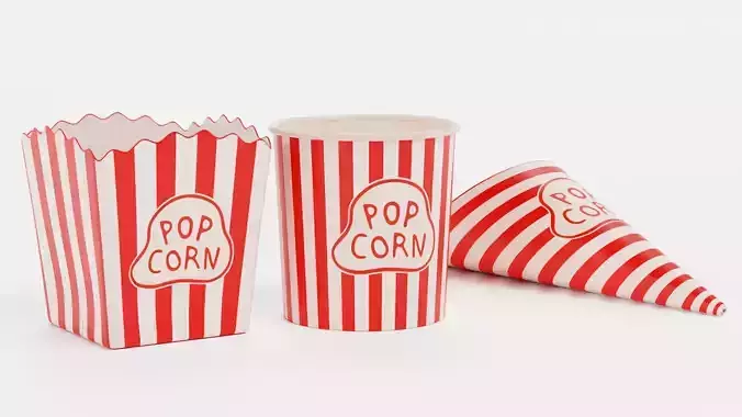 A collection of three popcorn containers designed for cinematic and food-oriented scenes. The set includes a round bucket, a square cup with rounded edges, and a cone-shaped container, all sharing the same striped paper design and custom label. Together, they provide a flexible toolkit for building believable cinema, street-food, and lifestyle compositions with consistent visual language and realistic detail.