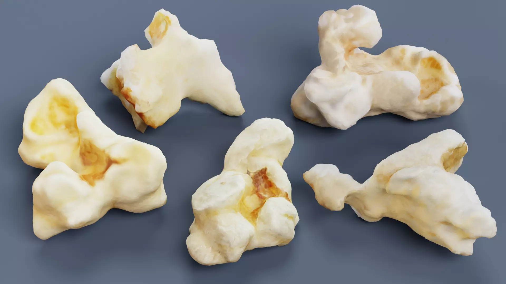 A multiple popped popcorn kernels with an irregular shapes and natural surface detail, capturing the subtle asymmetry typical of real popcorn. The asset feels organic and has a clean geometry and balanced shading. It works naturally both as a standalone prop and as a building block for larger popcorn compositions. It fits food visualization, product scenes, cinematic close-ups, and motion graphics,
