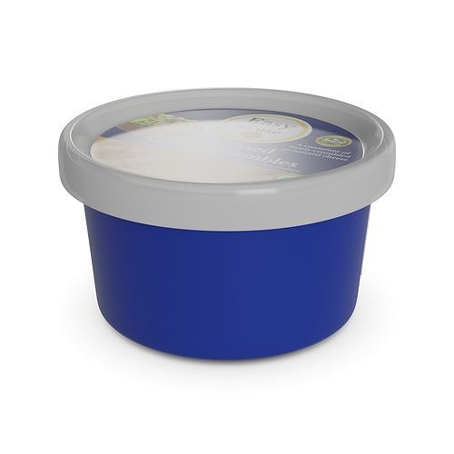Processed Cheese Crumbles: A container of finely crumbled processed cheese, ideal for sprinkling over salads or pasta dishes. The container is made of transparent plastic, allowing you to see the golden yellow color of the cheese inside. The lid is easy to open and close, ensuring the convenience of using the cheese. The packaging includes a label with the text Easy to Use and a graphic of cheese crumbles being sprinkled.