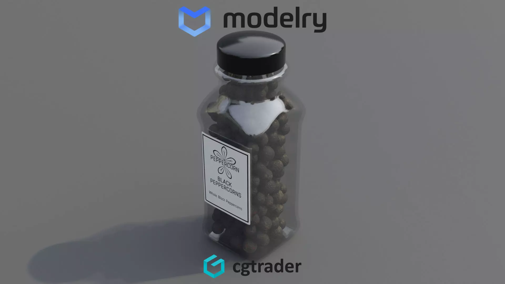 Whole Black Peppercorns: A glass bottle filled with whole black peppercorns, known for their bold and spicy flavor. The bottle has a sleek design with a black plastic lid that ensures the freshness of the peppercorns. The label on the bottle features a black and white color scheme, with the text Whole Black Peppercorns in bold letters, accompanied by a graphic of a peppercorn.