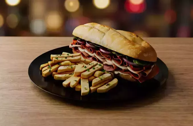 This high-quality, realistic 3D food model features a delicious sub sandwich served with crispy French fries, carefully crafted for professional visualization, games, animations, and restaurant marketing.Every detail has been modeled with realism in mind — from the soft bread texture and layered deli meats to the natural shape and surface variation of the fries.
