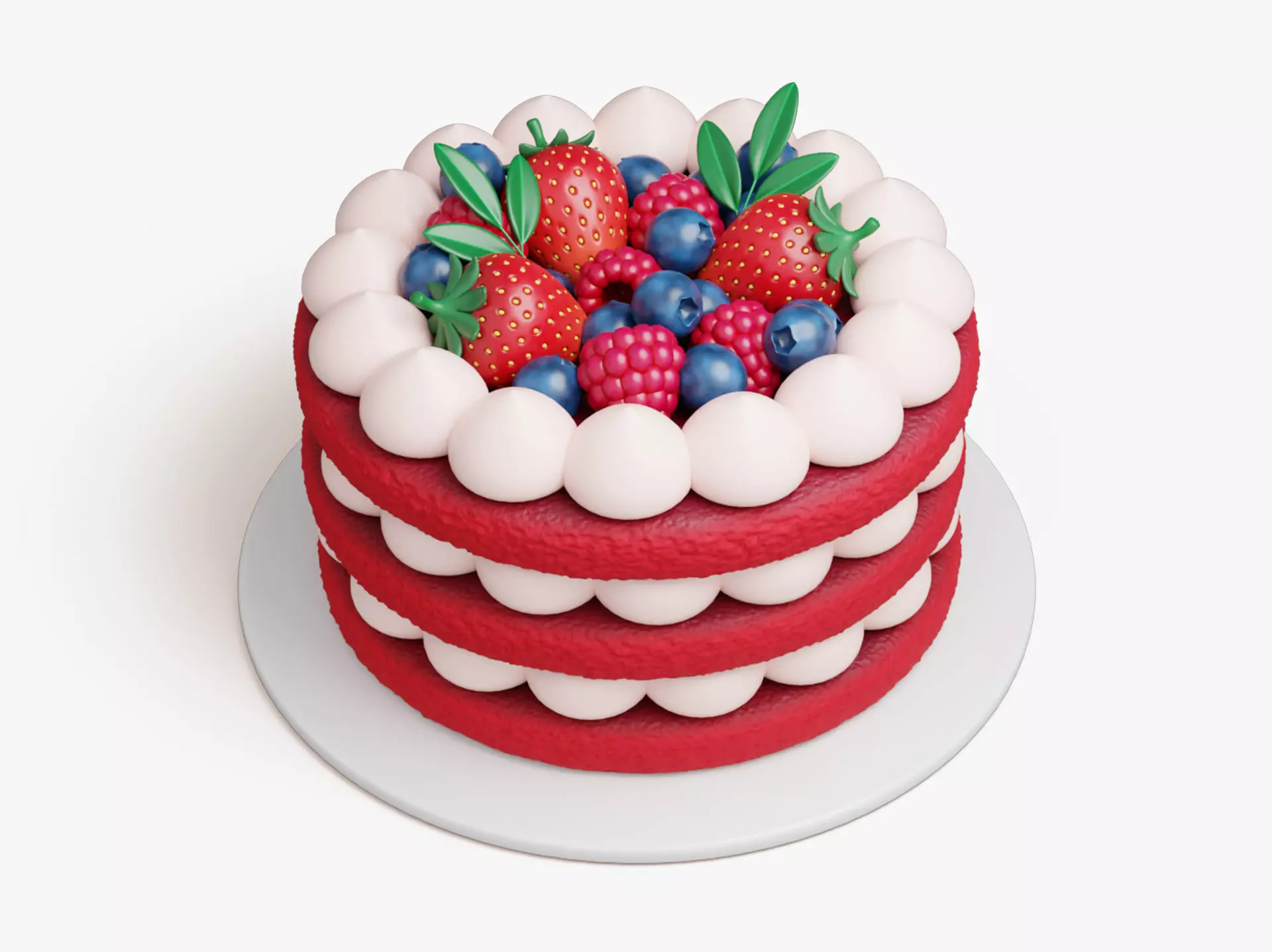 This stylized Red Velvet cake features an open-layer design with two vivid crimson sponge rings and evenly spaced white cream dollops that form a clean circular rhythm. The top is filled with a bright berry mix—strawberries, raspberries, and blueberries—accented by simple green leaves. Smooth surfaces, soft shadows, and precise proportions keep every element readable, while the saturated palette delivers a cheerful, modern bakery look with clear, cartoon-friendly shapes.