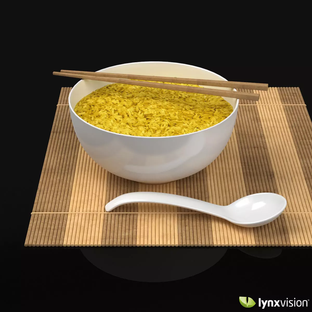 Detailed 3d model of a white porcelain spoon and bowl with rice, wooden chopsticks and a bamboo table mat.