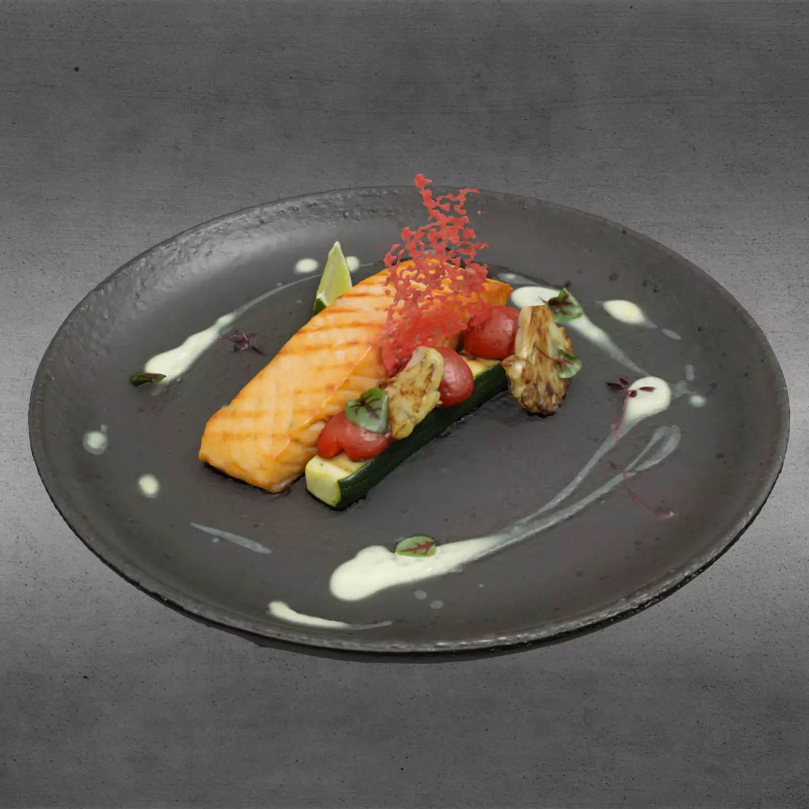 All visual characteristics are preserved from the real dish:• natural salmon fillet thickness and surface flaking• realistic grill marks and color gradients• authentic sauce viscosity and splash patterns• accurate vegetable shapes and placement• balanced restaurant-grade plating composition