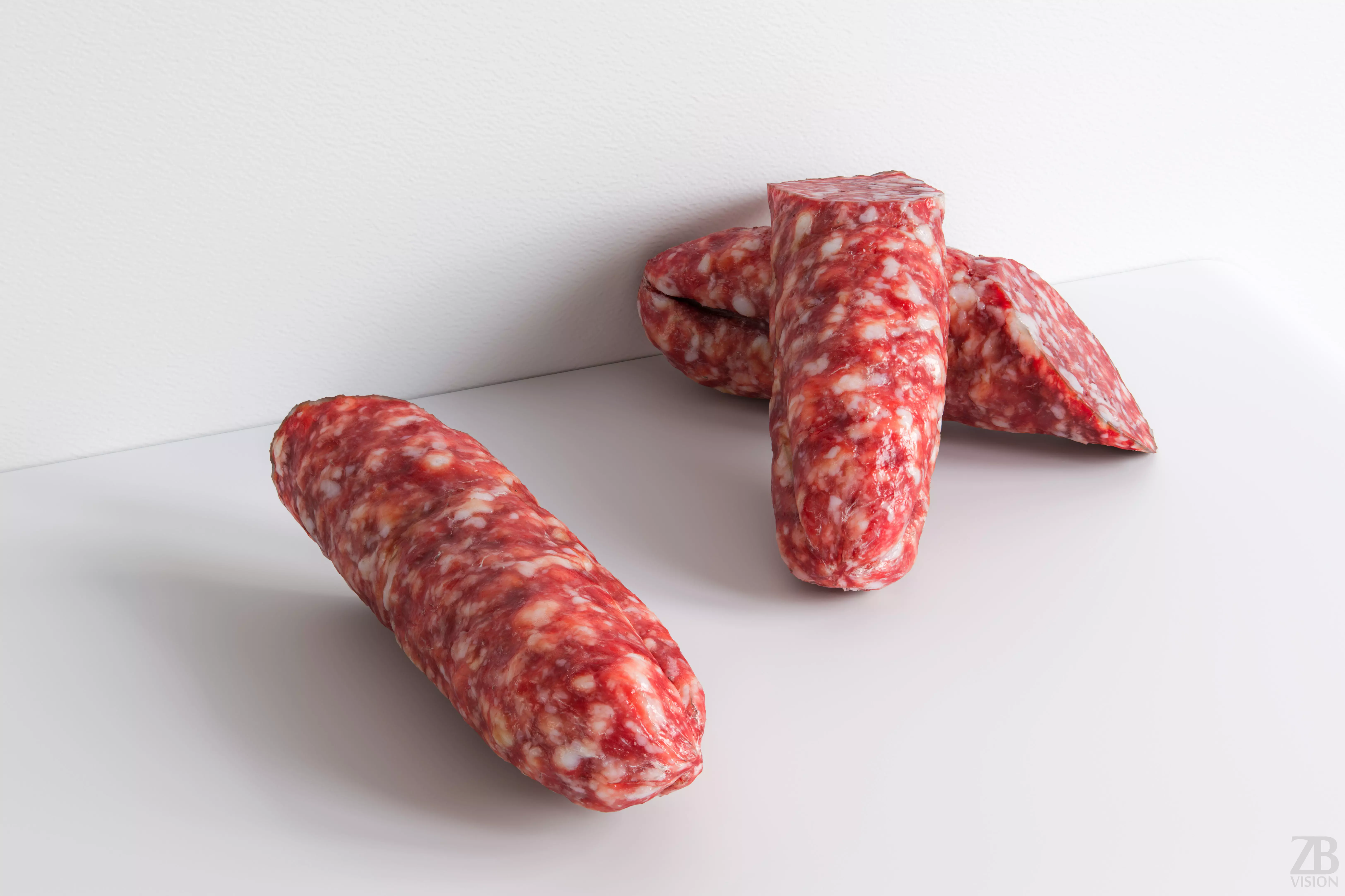 The salami model is presented as single mesh in 2 versions: low and high. Mesh is quad based. Base low model polycount is 960. High detail model included in .max, .fbx, .c4d, .stl and .obj formats. High detail model has 983k quads. Raw scan mesh is also provided in .obj format.