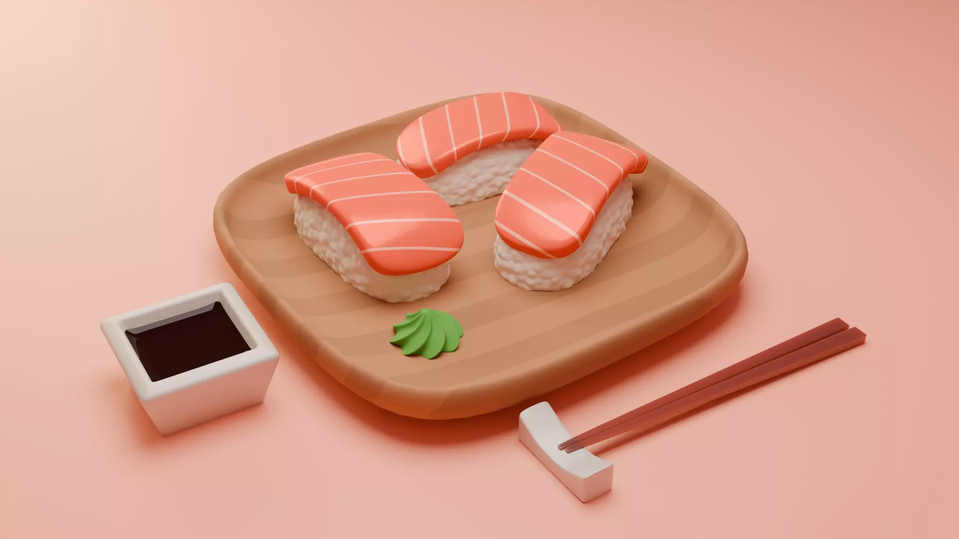 • Cute stylized salmon sushi served on a wooden plate. Created using Blender 4.0, renderer engine using Cycles, with Lighting set up in Blender file, made in low-poly with subdivision surface applied.