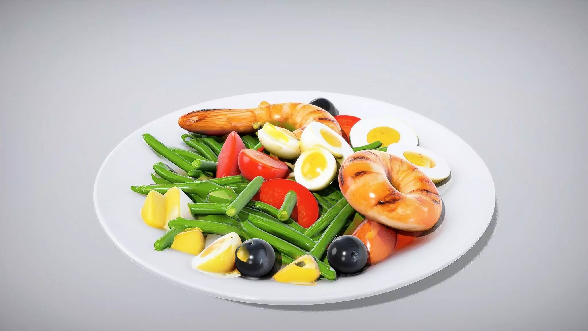 This Seafood Niçoise salad model captures the essence of a classic French dish with a modern seafood twist. Each ingredient is meticulously crafted to showcase vibrant colors and textures, making it perfect for culinary visualizations or restaurant menus. Each model has 3 levels of detail with QUAD polygons: