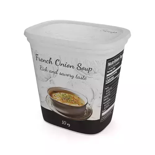 French Onion Soup: Indulge in the rich and savory flavors of French onion soup. Packaged in a eco-friendly, biodegradable paper container, this soup is not only delicious but also environmentally conscious. The packaging features a minimalist design with a subtle onion pattern, along with the words French Onion Soup in elegant, script font. Each container holds 10 ounces of soup, making it a perfect choice for a light and flavorful meal.
