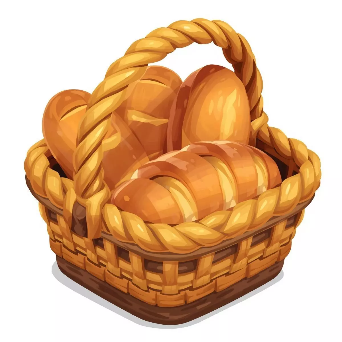The model features a chunky, square-based basket woven from thick, golden straw, complete with a sturdy twisted rope handle. It is packed to the brim with stylized, glossy baked goods, including long loaves and round buns, all rendered in appetizing shades of honey-gold and brown. The bold highlights and soft shadows give it a delightful 2D/3D illustrated look.