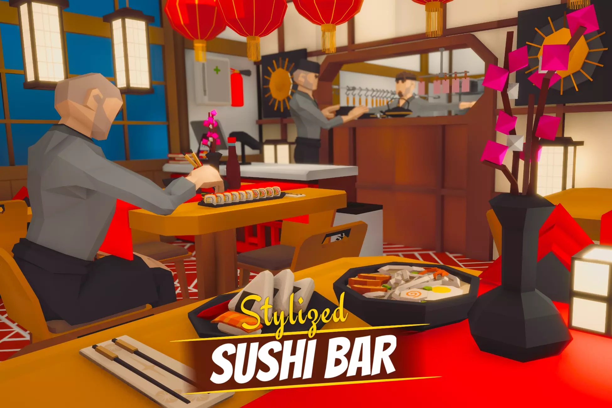 PropsMenu (x2), cash register (x2), bamboo sticks, doping containerSushi container, table lamp, knife (x3), cutting board, orders, frying pan, rack, sushi mat, pot (x2), container, washbasin, ventilation (x1), electric stove, deep-frying, kitchen table, whisk, thermometer, scapula, small ladle, flat spatula, bowl (x3), takoyaki stove, oven, spices (x2), shelf, counter, maneki-neko, top cabinet, neon sign (x2), Japanese lantern (x3), lantern hanger, fan, scale, signboard (x2), external ventilation (x4), street sign (x6), fire extinguisher, medicine chest, wires for carrying, trash can (x2)