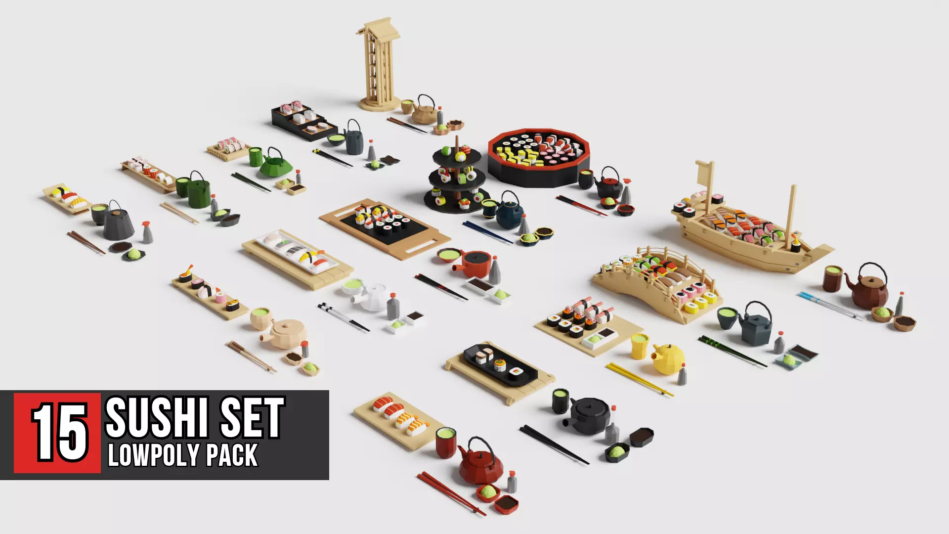 This package contains 15 packs of low-poly sushi set with 15 types of plates, tea sets, wasabi/soy sauce cups, chopsticks, soy sauce bottles, and 75 sushi. There is 1 file that includes all models and there is also a file that is separated into 196 files each (90 foods, 15 drinks, 91 items).
