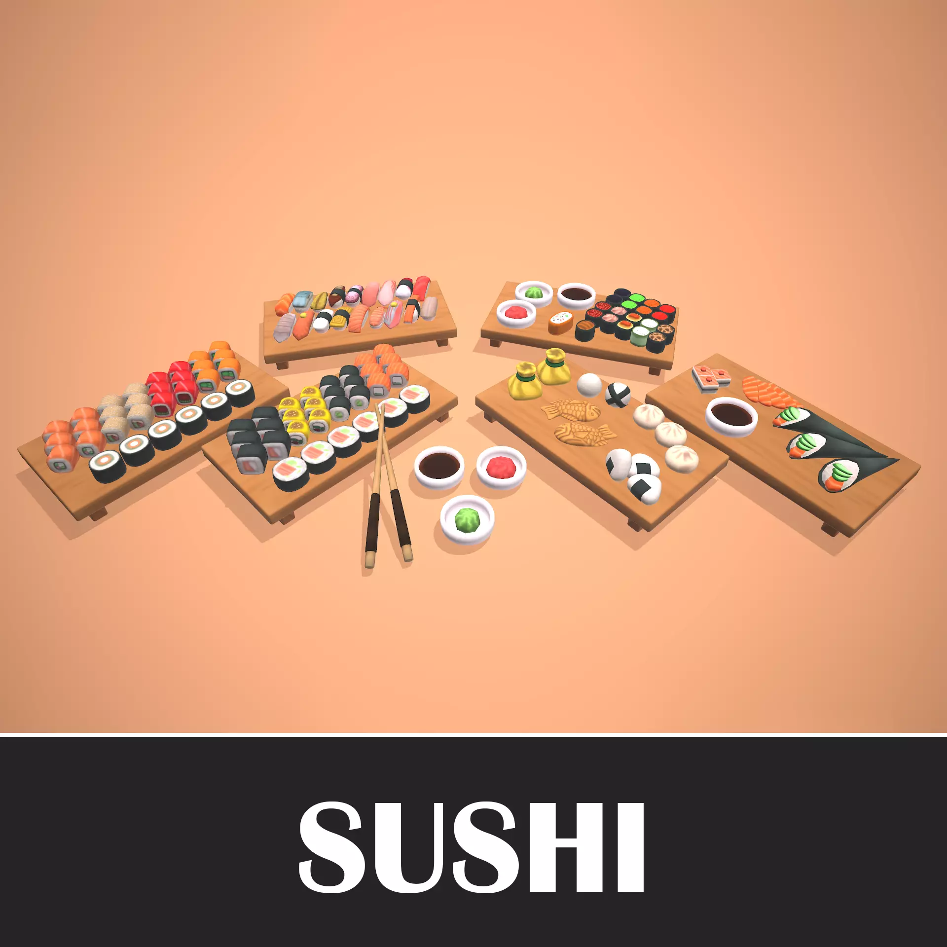 This pack includes 54 models of sushi.