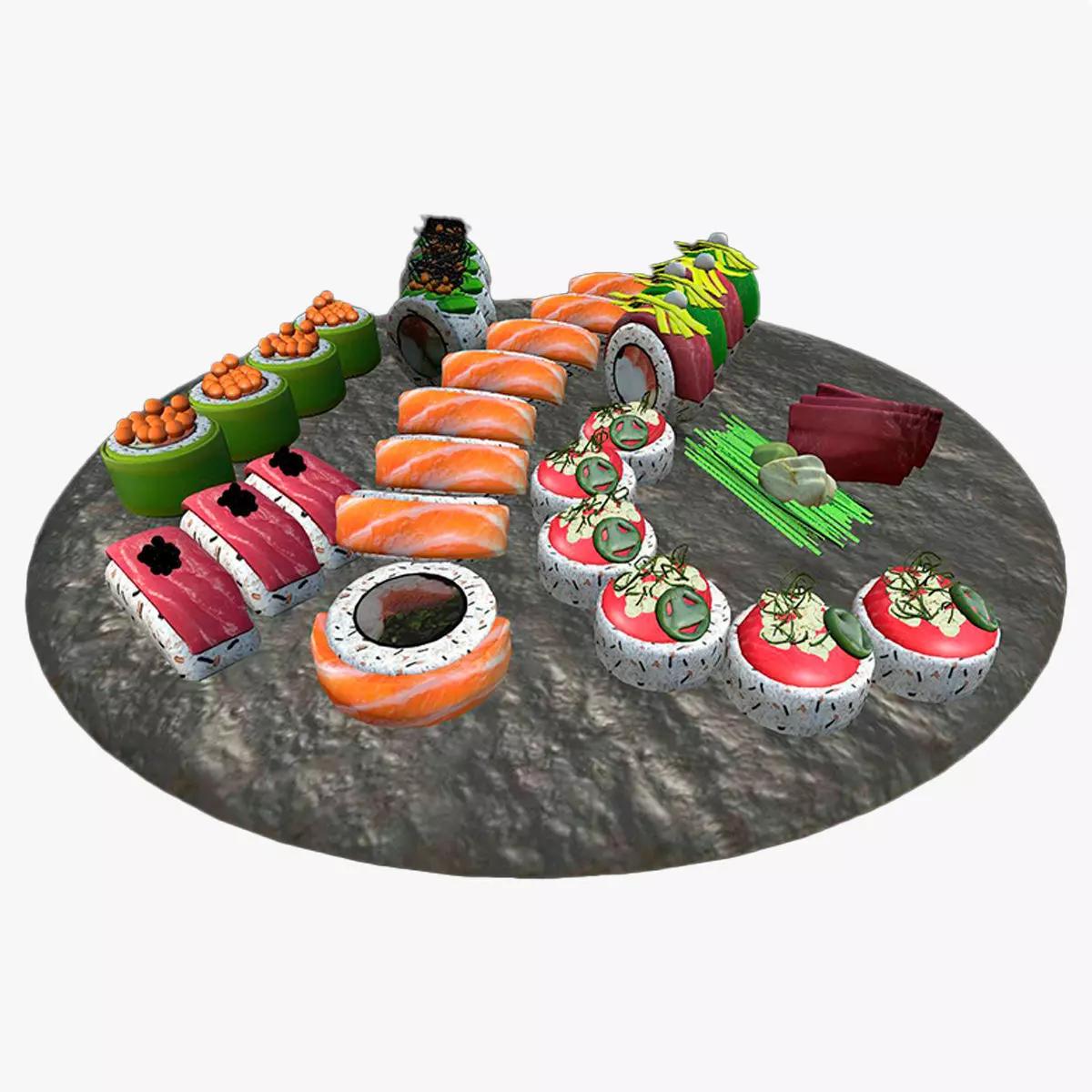 Gourmet Sushi Platter and Stone BoardOptimized for: Food Visualization | Restaurant Staging | Advertising Renders | Interior PropsKey FeaturesComprehensive Variety: This extensive set features a diverse selection of rolls, including salmon nigiri, uramaki with varied toppings, maki, and fresh sashimi slices.Artisanal Presentation: All elements are professionally arranged on a realistic dark stone circular board, complete with traditional sides like wasabi, ginger, and garnishes.Detailed Textures: High-resolution PBR materials capture the delicate grain of the fish, the porous texture of the rice, and the intricate details of toppings like roe and microgreens.High-Fidelity Mesh: Optimized topology ensures smooth silhouettes and realistic proportions, making the models suitable for high-end close-up renders.