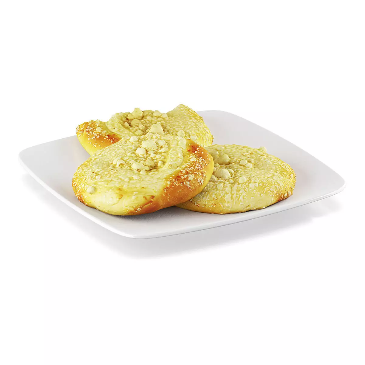 3d model of three sweet rolls - one is half eaten. 3d scanned from real product. Placed on square white plate.