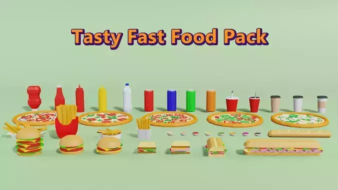 A low-poly tasty pack of pizzas, chips, hamburgers, sandwiches, sodas, coffee cups, etc., for your fascinating game