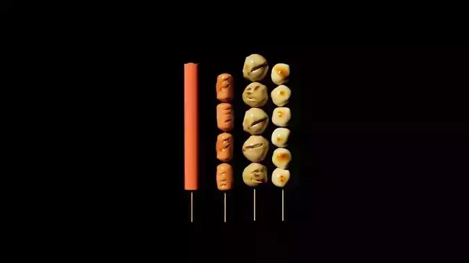 Bring the authentic vibe of Thailand's bustling street markets to your 3D scenes with this high-quality Thai Street Food Skewer Collection (Look Chin Ping). This set features four distinct and popular types of grilled appetizers, perfectly modeled to capture the appetizing texture and grilled aesthetic found in Asian street food culture.