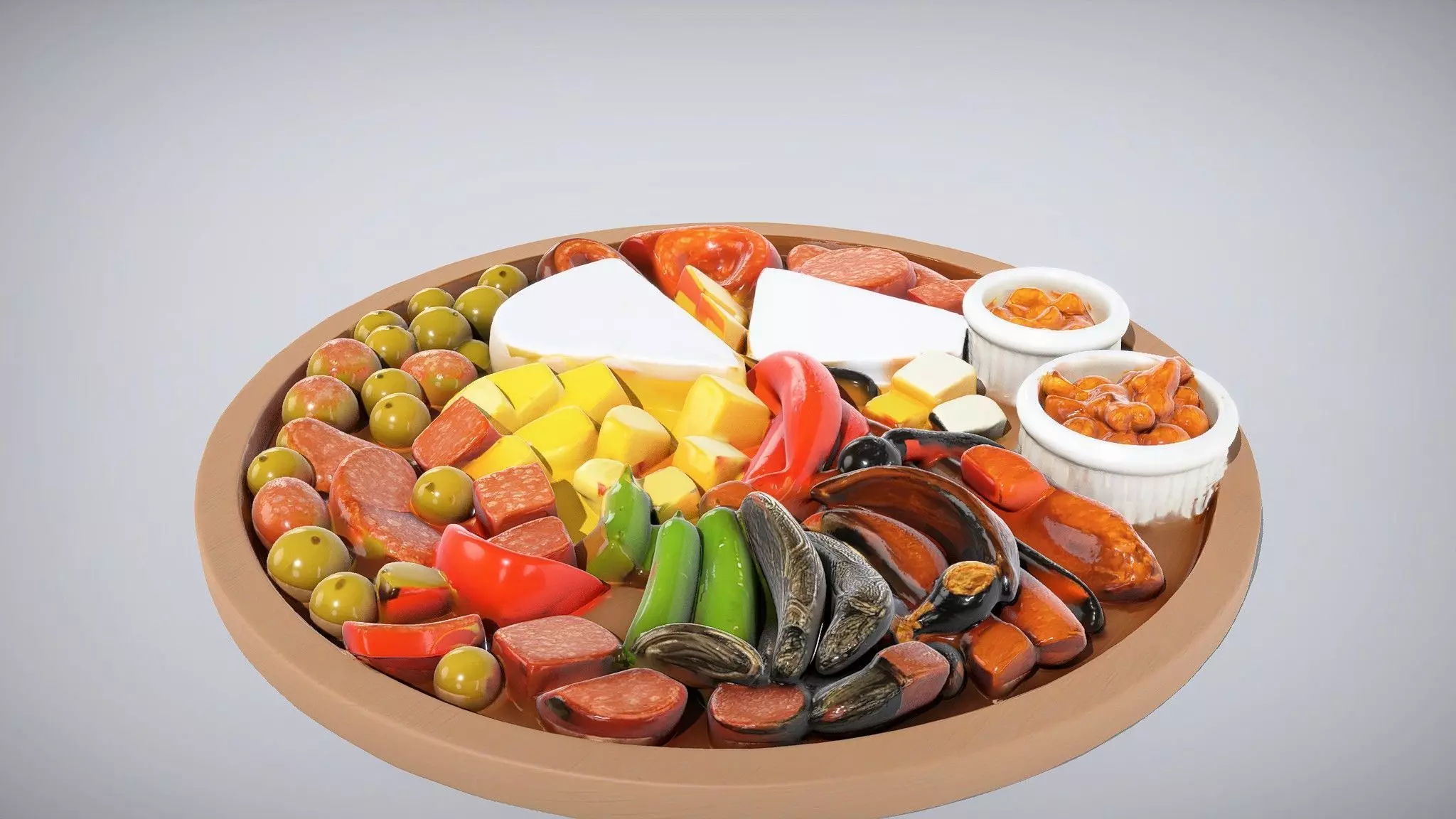 This model features a large round wooden tray filled with a colorful assortment of Spanish tapas, showcasing rich textures and vibrant colors. Each item is meticulously arranged for a photorealistic presentation. The model is suitable for culinary visualizations, restaurant menus, and food-related projects.