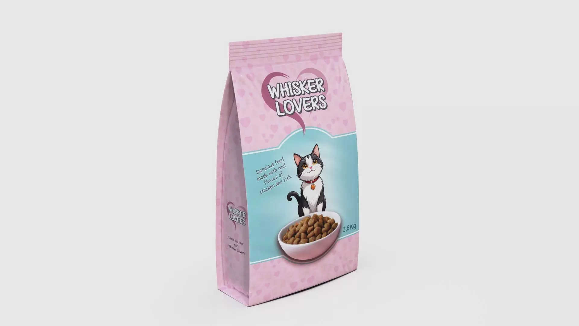 Whisker Lovers: Show your love for your furry companion with Whisker Lovers dry cat food. This heartwarming cat food is packaged in a charming pink bag, featuring an adorable illustration of a cat with a heart-shaped nose. The bag is made of a sturdy material, with a resealable closure to keep the food fresh. Inside the bag, you'll find 3.5 pounds of delicious kibble, made with real chicken and fish flavors. The packaging includes a label with a graphic of a cat with a wagging tail, indicating that the food brings joy to your pet's life. Share the love with Whisker Lovers.