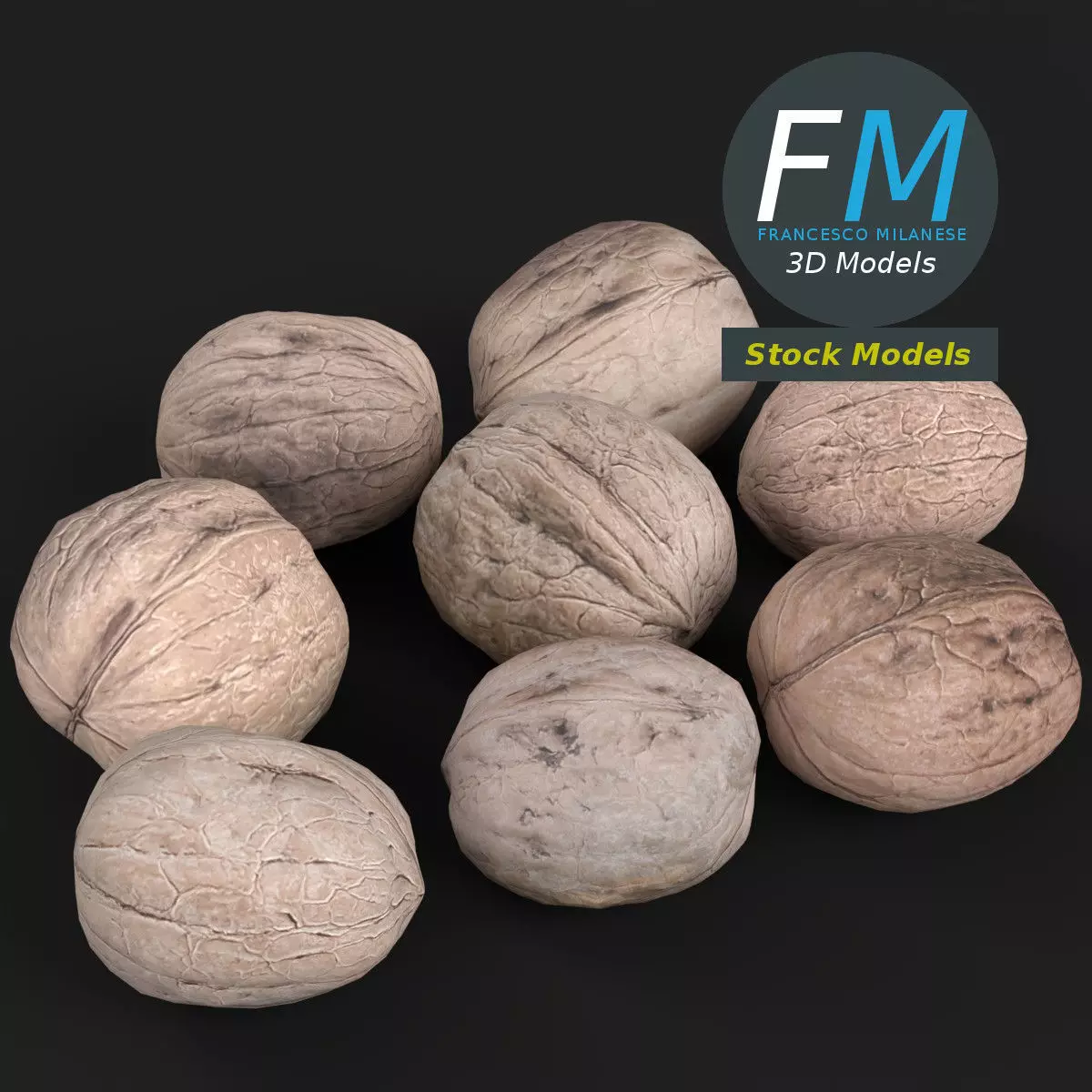 A set of 8 whole walnut shells (empty inside) 3D Models. 8 individual objects sharing the same non overlapping UV Layout map, Material, and PBR Textures set. Production-ready 3D Model, with PBR materials, textures, non overlapping UV Layout map provided in the package.Quads only geometries (no tris/ngons).Easily customizable: UV unwrapped geometries; UV Layout maps provided in the package as png with alpha images.Each Object, Material or Texture provided in the package has a unique, meaningful name.Made in Blender 4.3.2 with Cycles Principled BSDF PBR shader with textures included (Eevee compatible), then exported to OBJ and FBX; materials and textures made in Substance Painter (Adobe 3D Painter), exported for PBR, Cycles, V-Ray, Unity, Unreal.PROMO IMAGES: the first image has been rendered in Cycles for Blender; in particular, you can find 11+ promo images in this description: