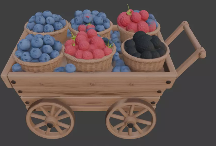 Detailed 3D model of a small wooden berry cart full of fresh berries in wicker baskets. Perfect for farm markets, cartoon games, village scenes, kids animations, mobile games, diorama, and cozy renders.Features: