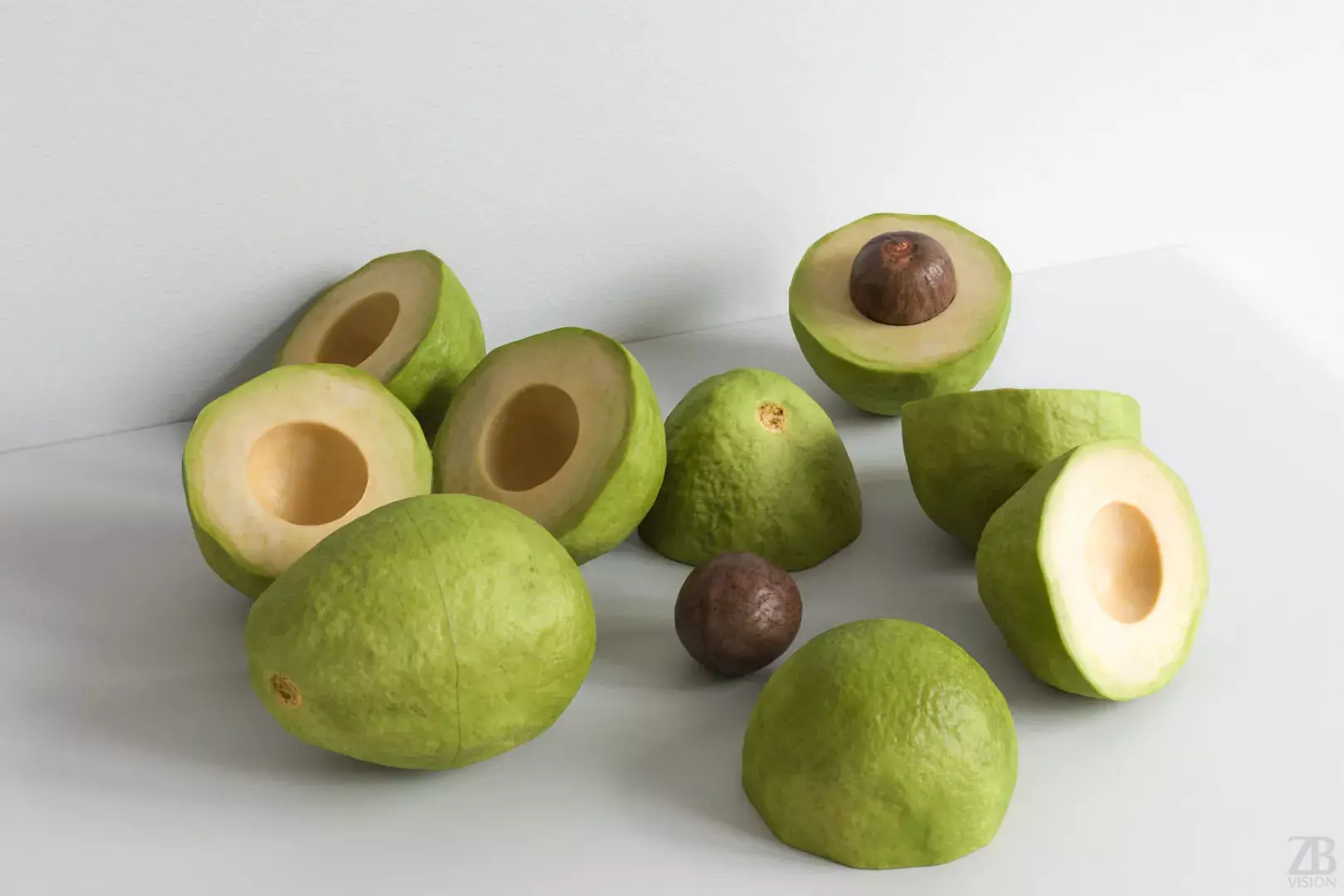 Photorealistic 3D peeled avocado model, 2 halves and a seed