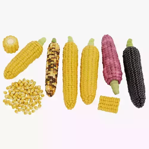A comprehensive 3D collection of corn assets featuring a carefully curated range of maize varieties and forms. The set includes multiple full corn ears, distinctive colored corn types, sliced cob pieces, and a naturally arranged pile of corn seeds. All assets share a consistent visual style, realistic proportions, and detailed surface treatment, making the collection easy to combine within a single scene. Designed to provide maximum flexibility for food props, agricultural visuals, and realism-focused environments.