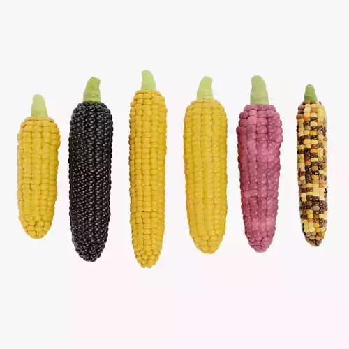A 3D collection of six corn ears featuring both classic yellow maize and distinctive specialty varieties. The set includes yellow corn in multiple proportions alongside Hopi pink, flint corn with multicolored kernels, and Aztec black (Morado) maize. Each ear is modeled with individually shaped kernels and a natural green pedicel, offering a visually rich selection suitable for scenes that require diversity and authentic detail.