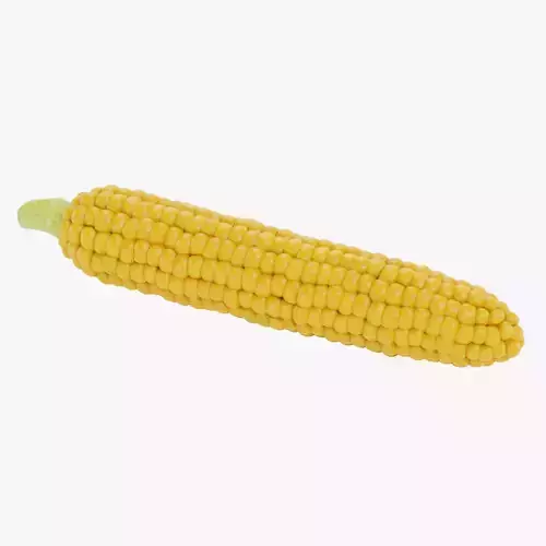 A realistic 3D model of a yellow corn ear with organically arranged maize kernels, showing natural variation in size and form across the surface. The individually modeled kernels create a convincing, non-uniform texture typical for real corn. A green pedicel at the base completes the harvested appearance and reinforces the authentic structure of a full corn ear. Suitable for food props, agricultural visuals, educational scenes, kitchen environments, farming-related projects, and realism-driven 3D compositions.