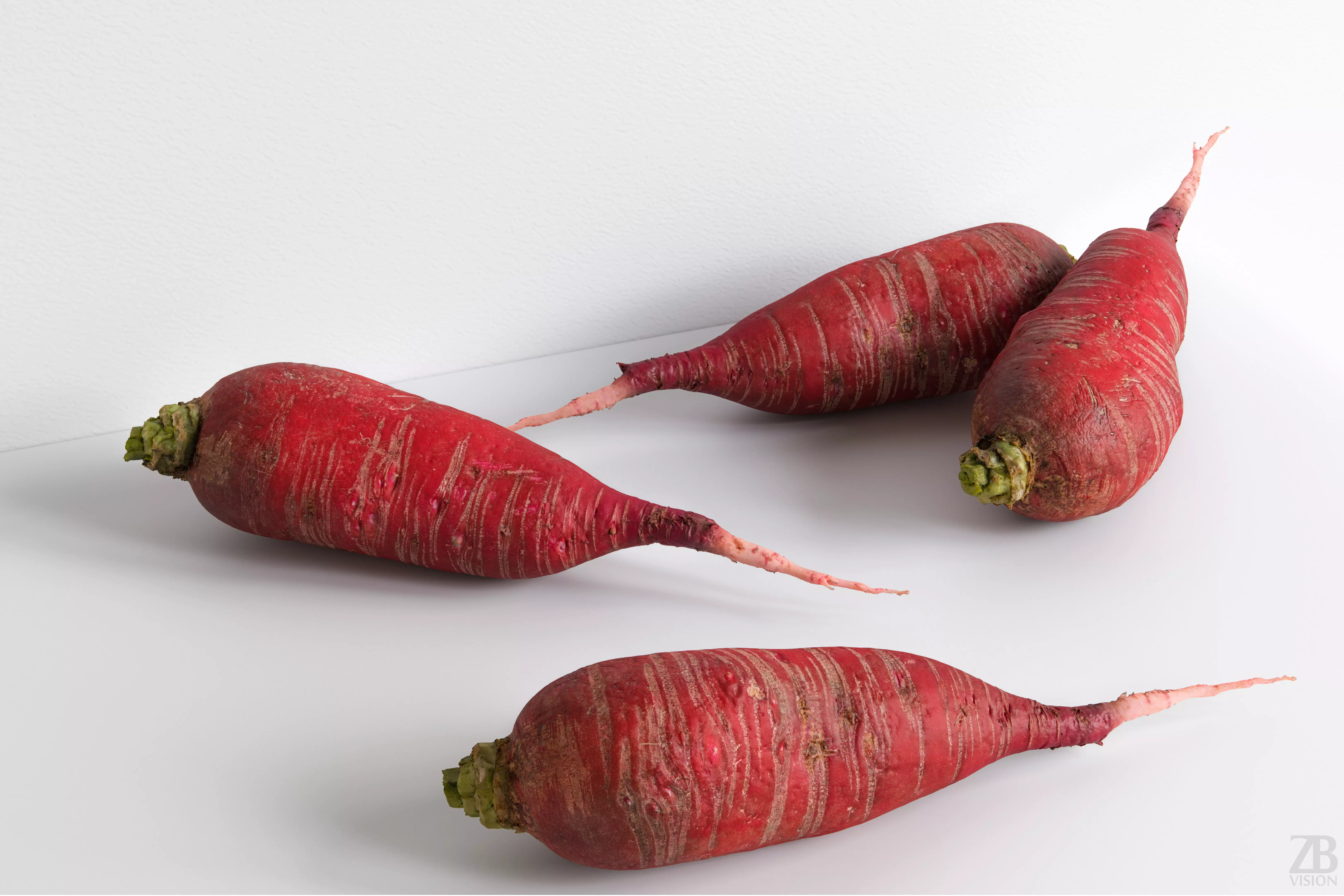 This is a 3D model of a red daikon aka Japanese radish. It was scanned and prepared for photorealistic renderings, close-ups, stills, and animation. The daikon model is ready to be inserted into your scene out of the box.