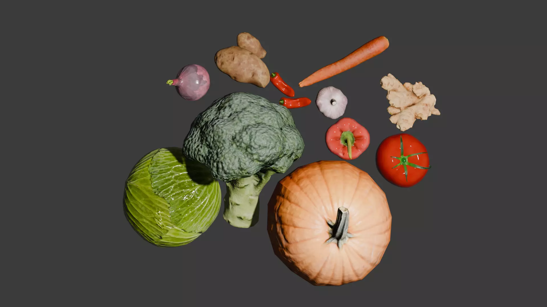 This vegetable pack include a collection of fresh detailed 3d vegetables, perfect for kitchen scenes, food renders, games, animations and realistic product visualization. Vegetables pack include cabbage, cauliflower, ginger, garlic, pumpkin, onion, tomato, potato etc. Features: Low poly and optimized for performance.includes a variety of vegetables.Compatible with major 3d softwares. Suitable for realistic redering.