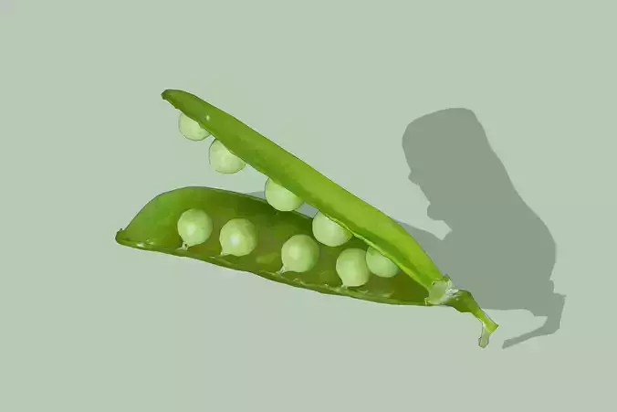 This is a 3D model of a pea pod, showcasing the internal structure and arrangement of the peas. The pea pod in the model has a naturally curved shape, with a green outer shell and fine surface textures, making it look very realistic. The pod is open, revealing the peas inside, which are round and light green in color, neatly arranged with each pea clearly visible. This model can be used in various scenarios such as education, design, and animation production, helping people better understand the structure of the pea pod and the growth state of the peas.