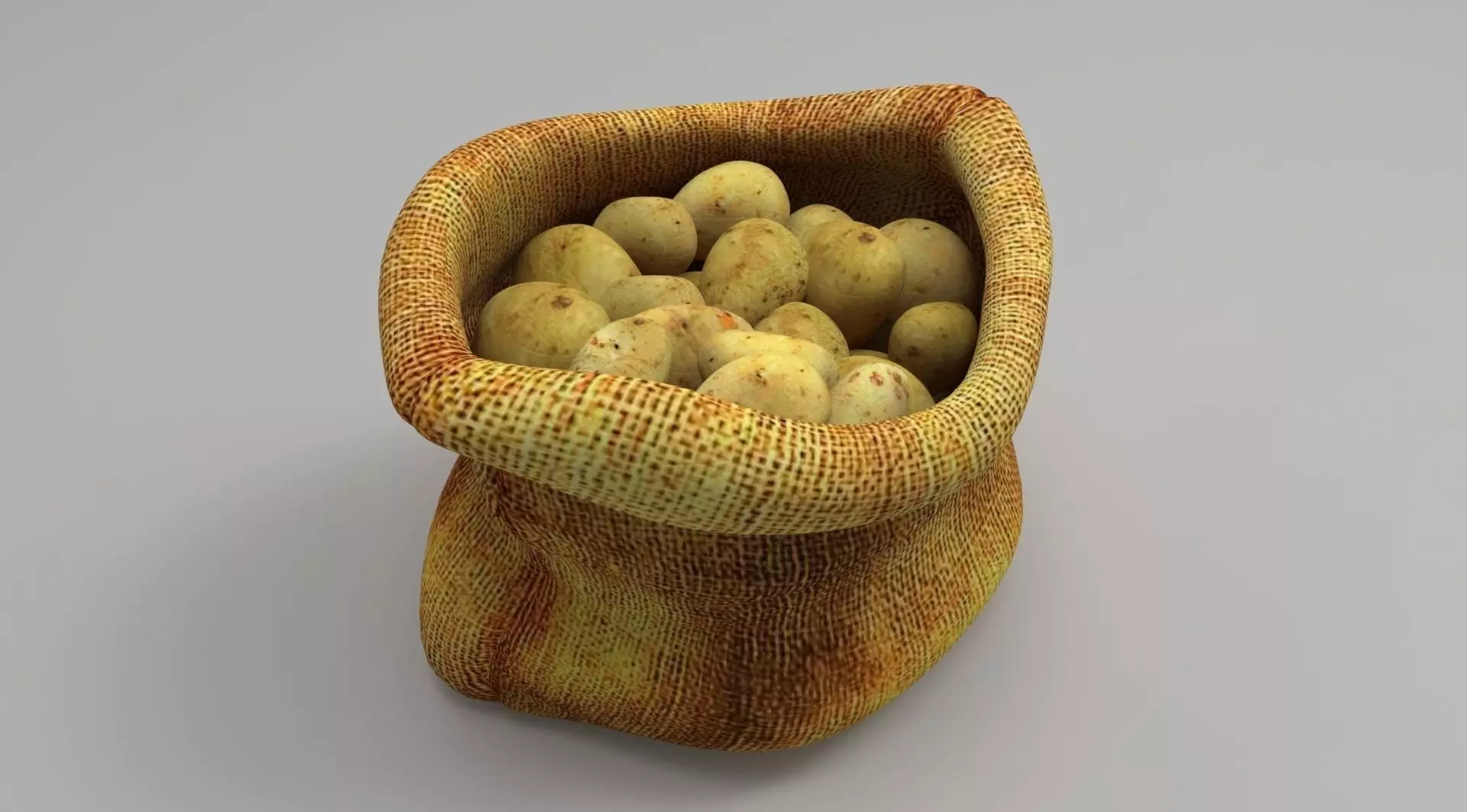 A potato sack 3d model This realistic looking 3d model of potato sack. FBX file format with embedded material is available for this model.model contains high resolution texture of potato and Sack. This is Low poly model( preview image is with subdivision level 1) and can be used in AR/VR also.