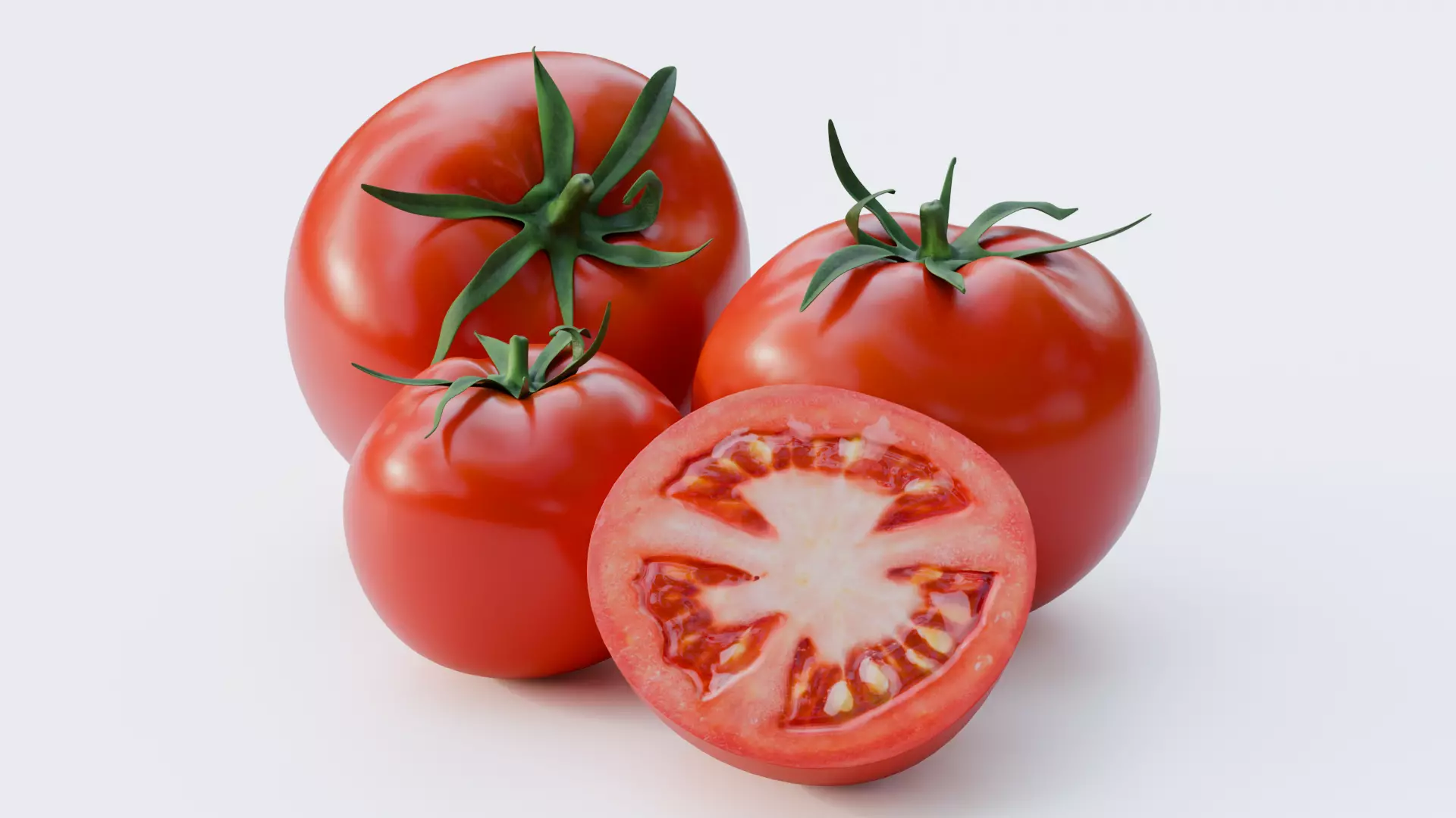 The model includes whole tomatoes and a sliced half, with detailed surface imperfections and accurate internal flesh structure