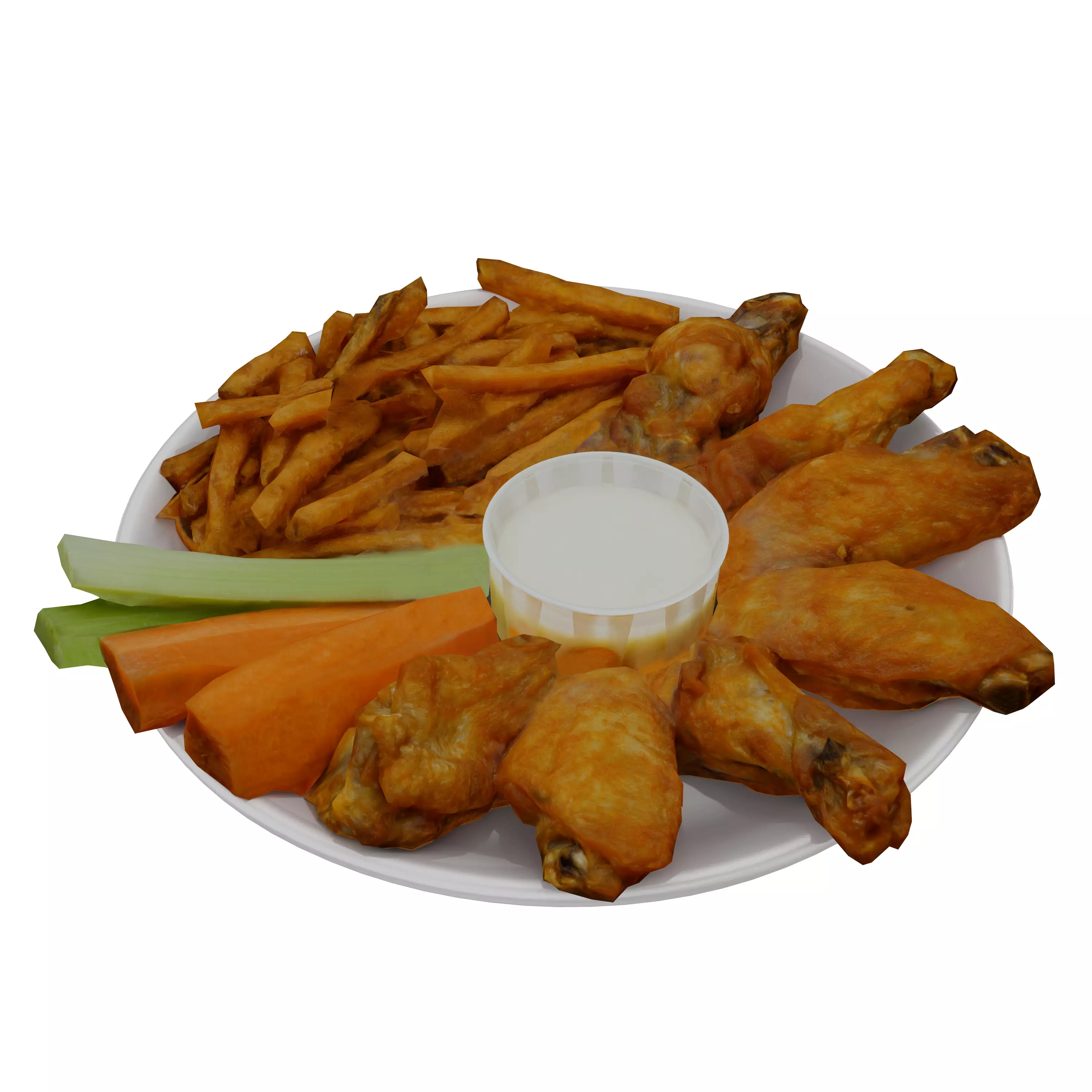 3d model of Traditional breaded wings with fries and cheese souse in low poly ready for VR/AR with one 4k texture