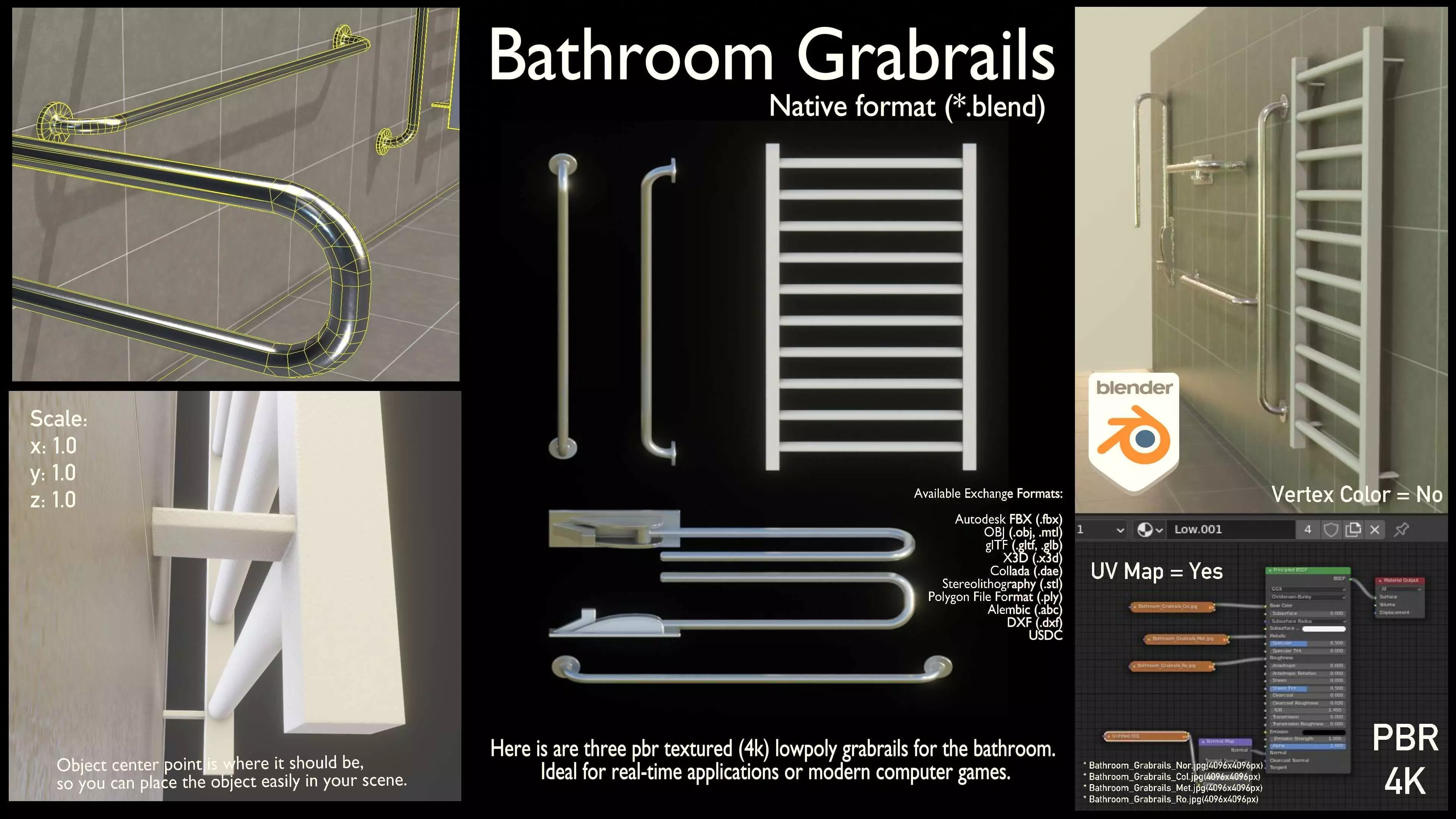 Here are three pbr textured (4k) lowpoly grabrails for the bathroom. Ideal for real-time applications or modern computer games.