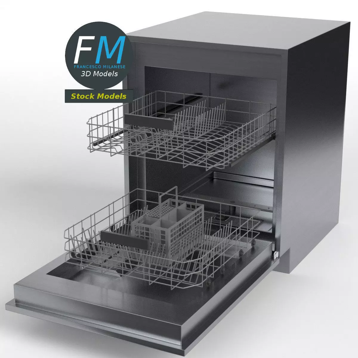 Dishwasher 3D Model. 7 individual objects (case, door, 2 spray arms, 2 trays, kitchenware basket), sharing 2 non overlapping UV Layout map, Materials and PBR Textures sets. Production-ready 3D Model, with PBR materials, textures, non overlapping UV Layout map provided in the package.Quads only geometries (no tris/ngons).Easily customizable: UV unwrapped geometries, so you can create new Textures (or modify the existing ones) using the UV Layout maps provided in the package (as png with alpha).Each Object, Material or Texture provided in the package has a unique, meaningful name.Made in Blender 3.3 with Cycles Principled BSDF PBR shader with textures included (Eevee compatible), then exported to OBJ and FBX (with embedded PBR Textures); materials and textures made in Substance Painter, exported for PBR, Cycles, V-Ray, Unity, Unreal.PROMO IMAGES: the first image has been rendered in Cycles for Blender; in particular, you can find 11+ promo images in this description:
