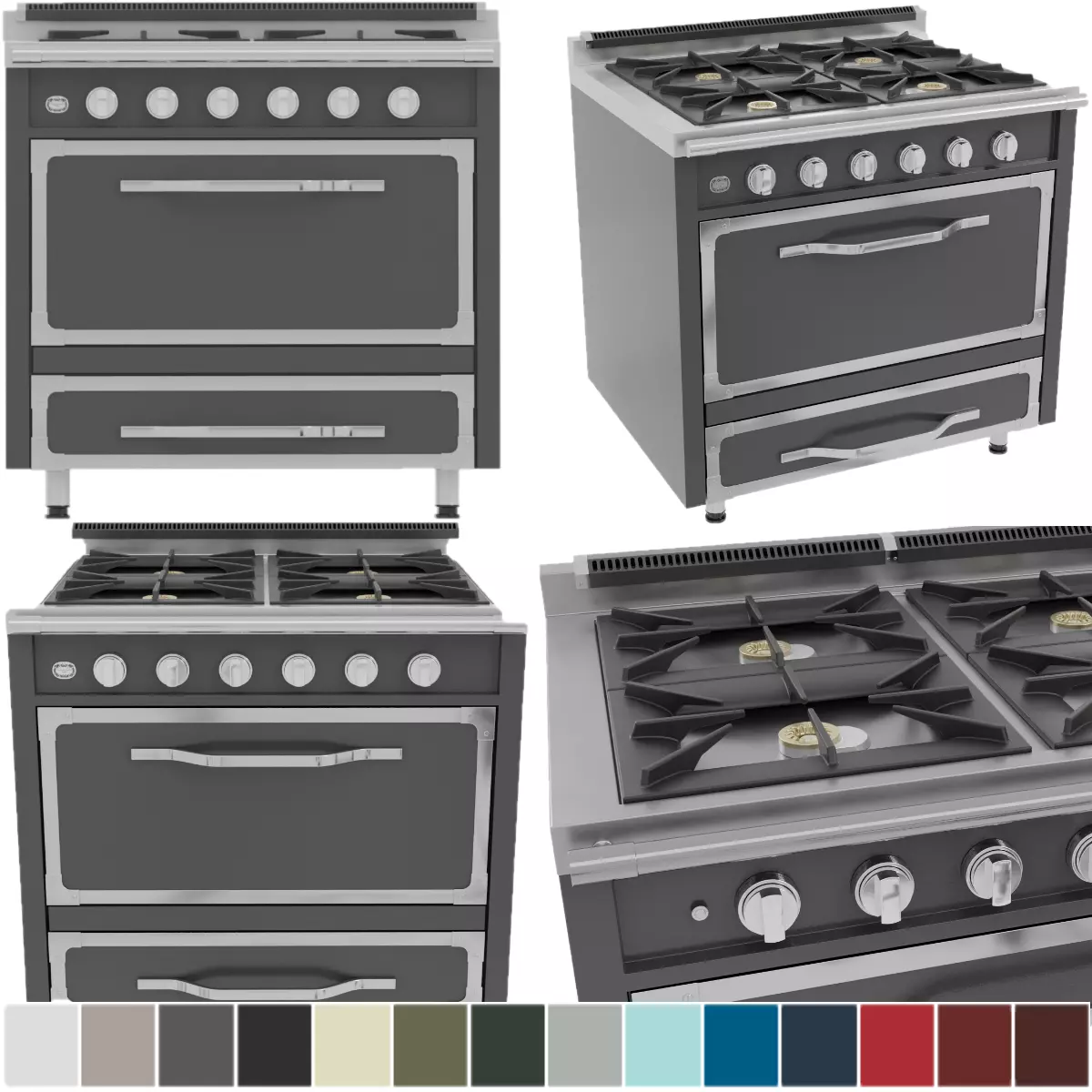 -Freestanding Range with 4 Burners model with 15 Material sets... Alluvial-Blue, Antique-White, Arctic-Grey, BlackForest-Green, ByWater-Blue, Cast-Black, Cypress-Green, Damascus-Grey, Frost-White, Kalamata-Red, Pacific-Grey, Reduction-Red, SanMarzano-Red, Slate-Blue, Vanilla-Cream.