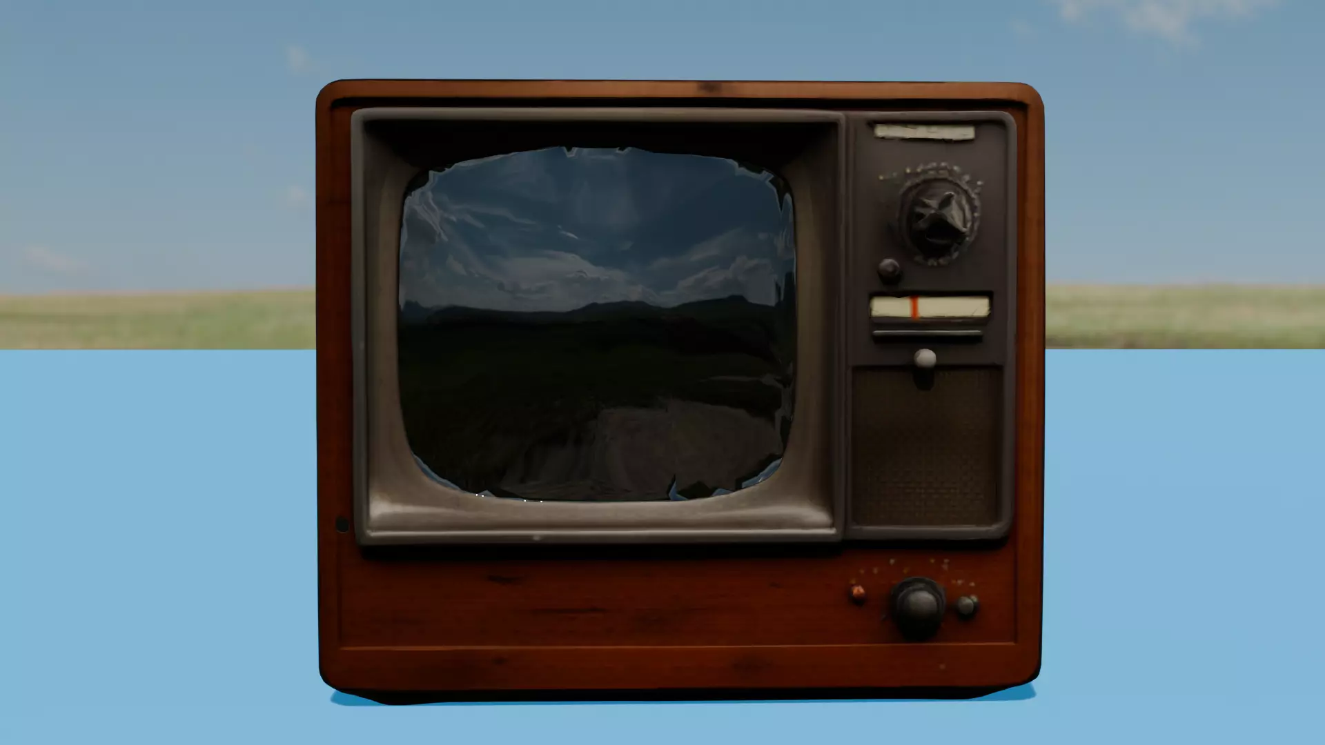 a low-poly 3D model of a vintage television set. Here's a breakdown of the model's characteristics:Geometry:The TV's body is composed of simple geometric shapes, such as rectangles and cylinders.The CRT screen is a flat, rectangular plane with rounded corners.The control panel is a flat, rectangular surface with raised knobs and buttons.The wooden cabinet is represented by a series of flat planes, with visible edges and corners.Polycount:The model has a relatively low polycount, with a focus on simplicity and clean lines.The TV's body is likely composed of around 100-200 polygons.The CRT screen and control panel are likely represented by a smaller number of polygons, around 20-50 each.Texturing:The model features a simple, low-resolution texture map.The wooden cabinet is represented by a wood grain texture, with a subtle pattern and color variation.The CRT screen is a flat, uniform color, likely a greenish-gray or beige.The control panel and knobs are represented by a simple, metallic texture.Lighting:The model is lit by a single, soft light source, likely positioned above and to the side of the TV.The lighting is subtle, with a focus on highlighting the TV's contours and textures.There are no harsh shadows or dramatic lighting effects.Overall, the low-poly 3D model of the vintage television set is a stylized representation that captures the essence of the original image. The simplicity of the geometry and texturing creates a clean, retro aesthetic that is reminiscent of early 3D graphics.