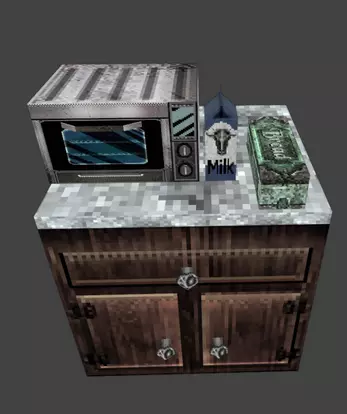 Apple (3D & 2D), Backers Rack, Banana (2D & 3D), Bleach Bottle, Blender base and mixer, Bread Tin lid and body, Broom, Burger, Butter Knife, Cake, Cardboard Box Cleaning, Carrot (2D & 3D), Chain links, Chem spray bottle, Cleaning Solution, Clean Spray, Egg (2D & 3D), Fork, French Bread, Frosted Pastry, Glove Box, Grapes (2D & 3D), Hanging Cookery, Hanging Kitchen Cabinets, Hanging Kitchen Cabnets.001(Middle Section), Hanging Kitchen Cabinets double, Hanging Kitchen Cabinets Single, Hot Dog, Jar Of Milk, Kitchen Cabinets, Kitchen Chair, Kitchen Sink, Kitchen Counters Long, Kitchen Counters Short, Kitchen Cup, Kitchen Dish Washer (Body, Door, Drawers), Kitchen Food Pantry, Kitchen Knife, Kitchen Lamp, Kitchen Pot and Pan Shelf, Kitchen Stove, Kitchen Table, Kitchen Toaster Oven, KitchenPan_1, KitchenPan_2, Kitchen Plate, KitchenSousPot_1, KitchenSousPot_1.001, Milk carton, Mop, Mop Bucket, Paper Towle Role, Pie, Pizza and single slice, Wisk, Refrigerator (body, door, shelves), Sandwich Bread, Spoon, Stove, Tea Pot, Tea Tray, and a red Toaster.